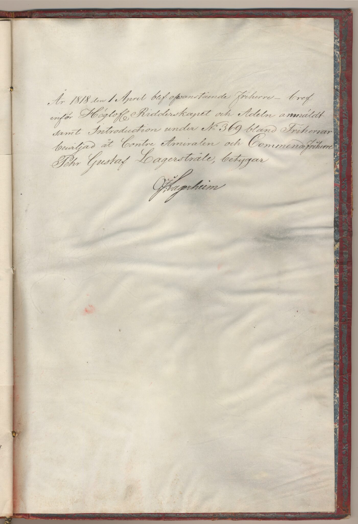 Friherrebrevet i original för utdöda friherrliga ätten Lagerstråle, nr 369.