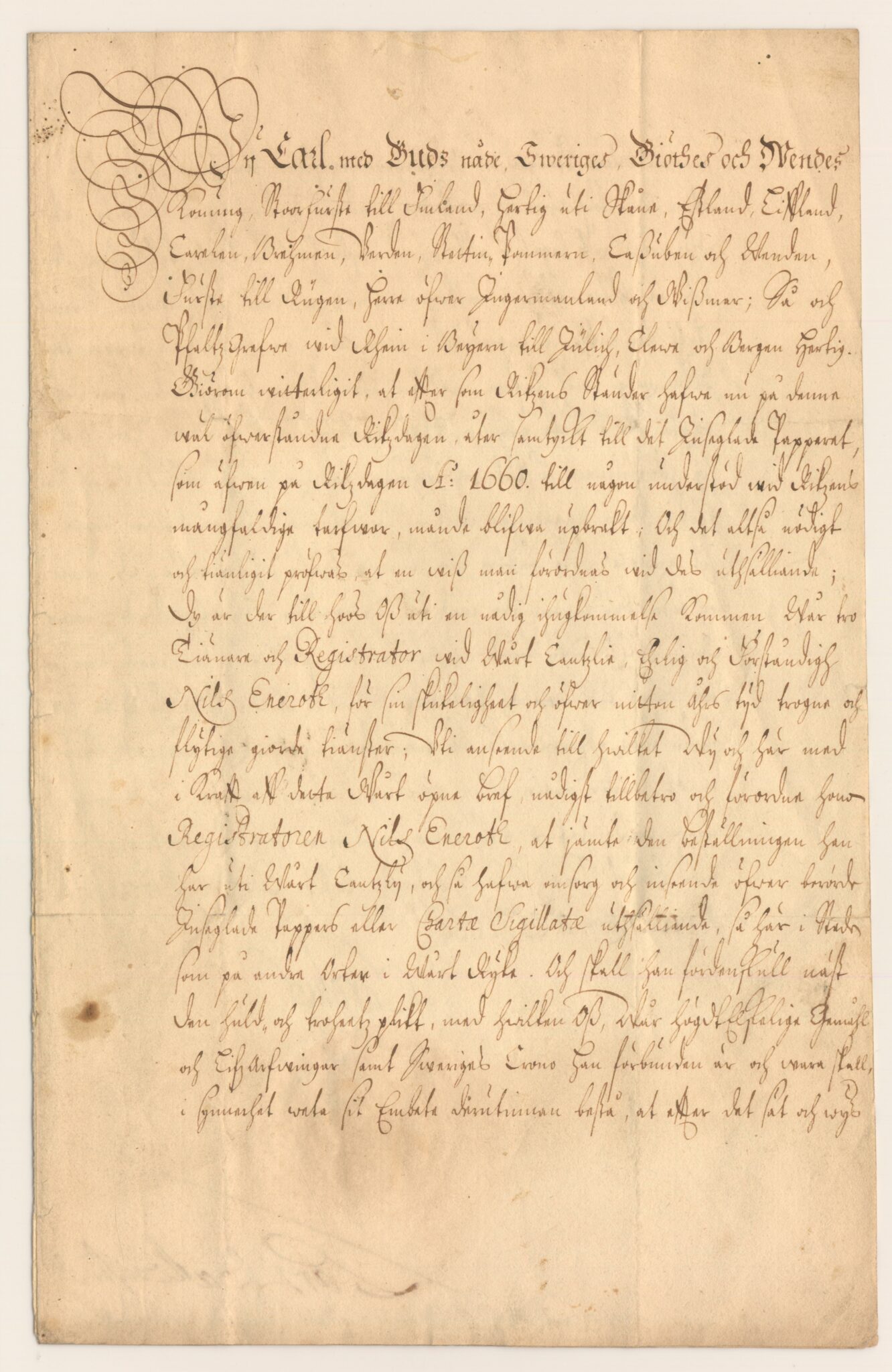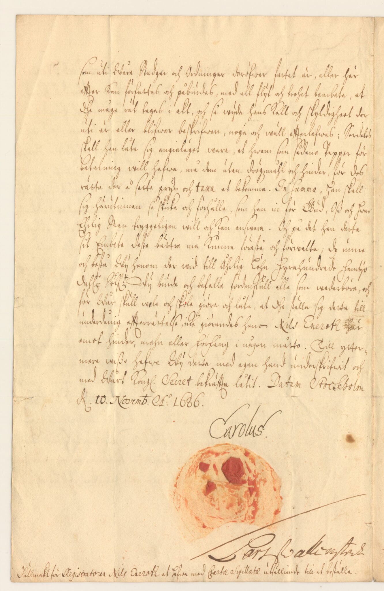 1. Kunglig fullmakt för registatorer till Nils Eneroth, 1686-11-10, Karl XI, 03.