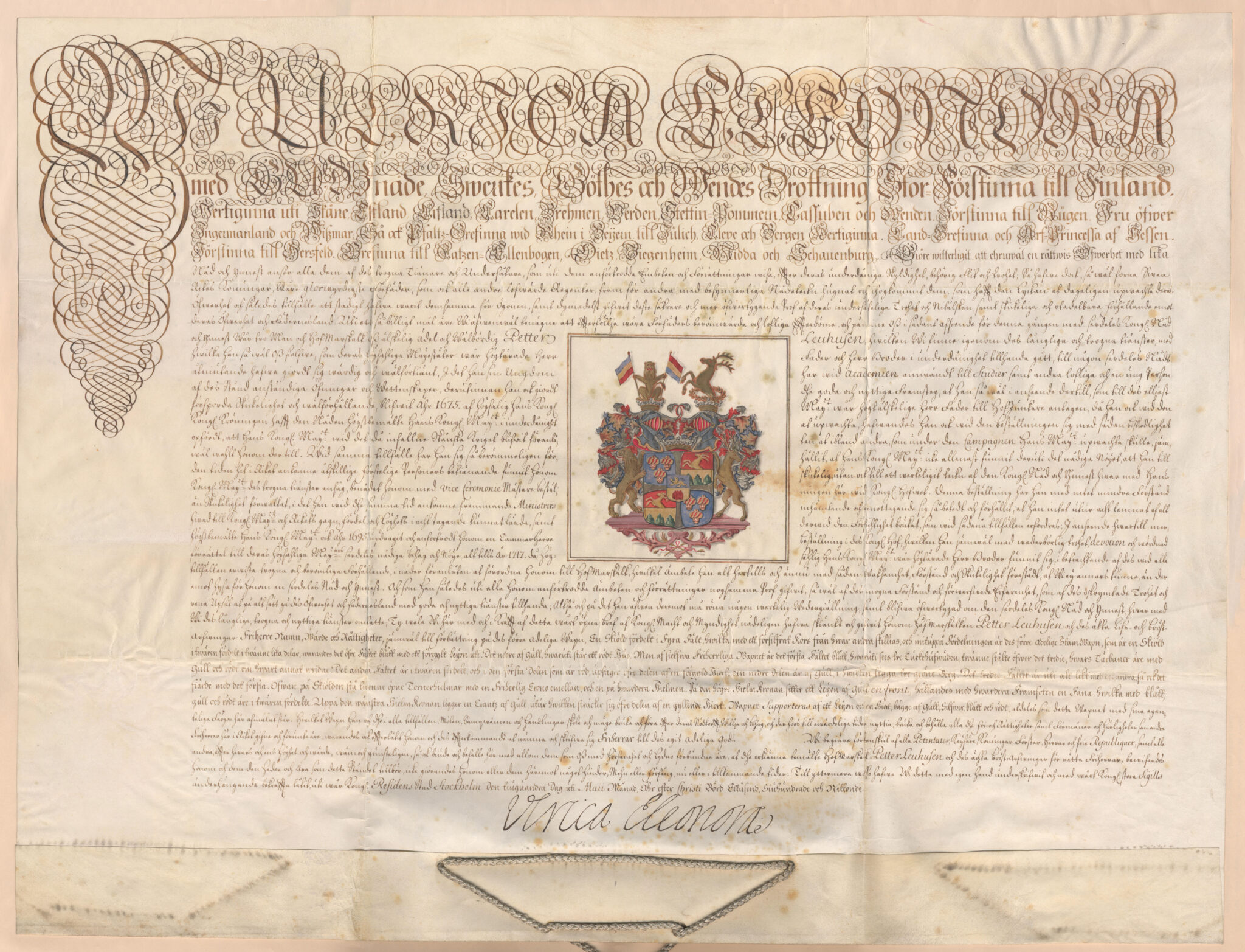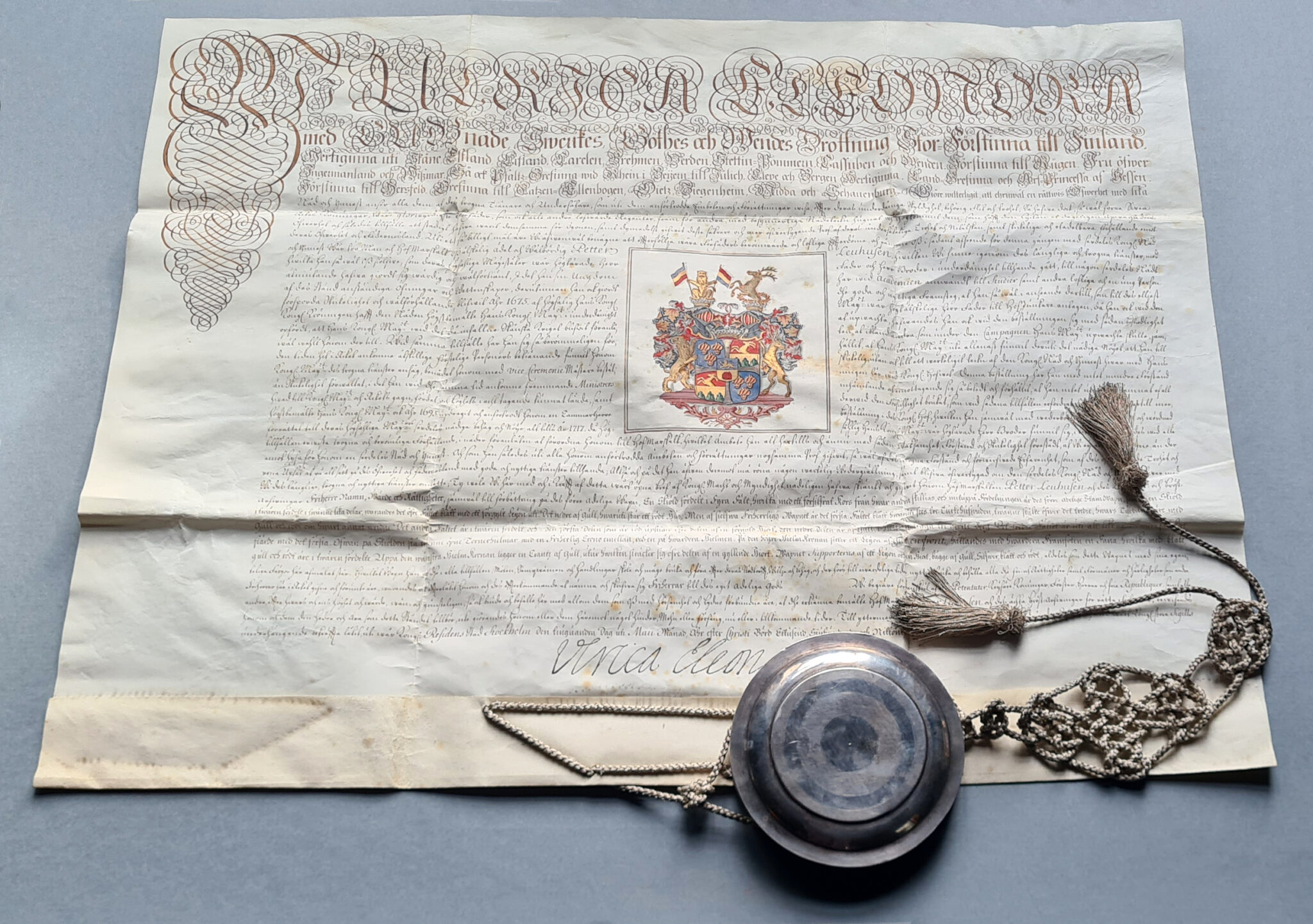 Friherrebrevet i original för friherrliga ätten Leuhusen, nr 140.