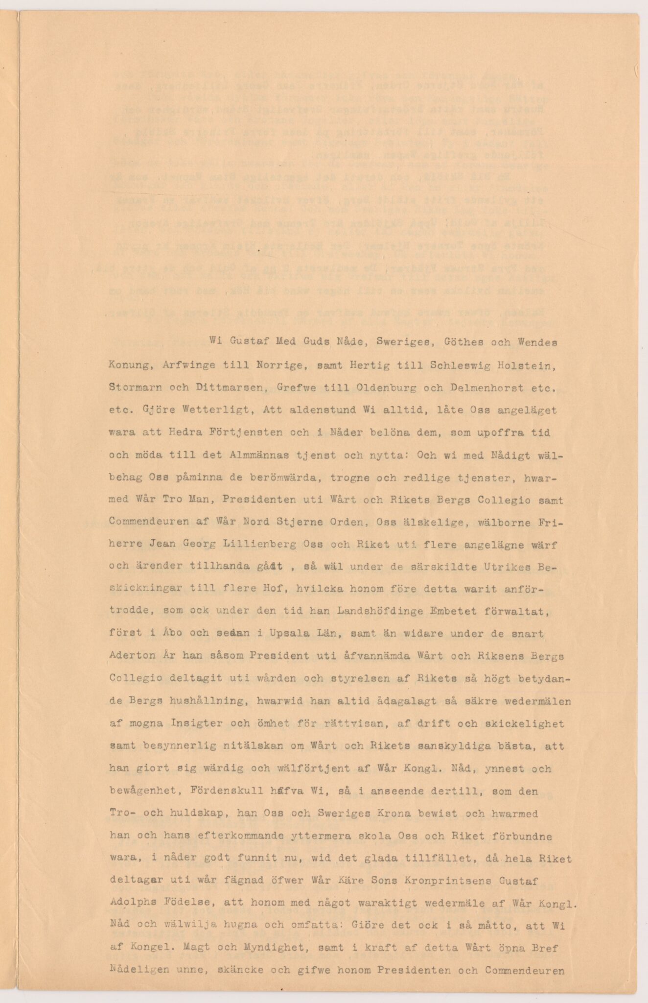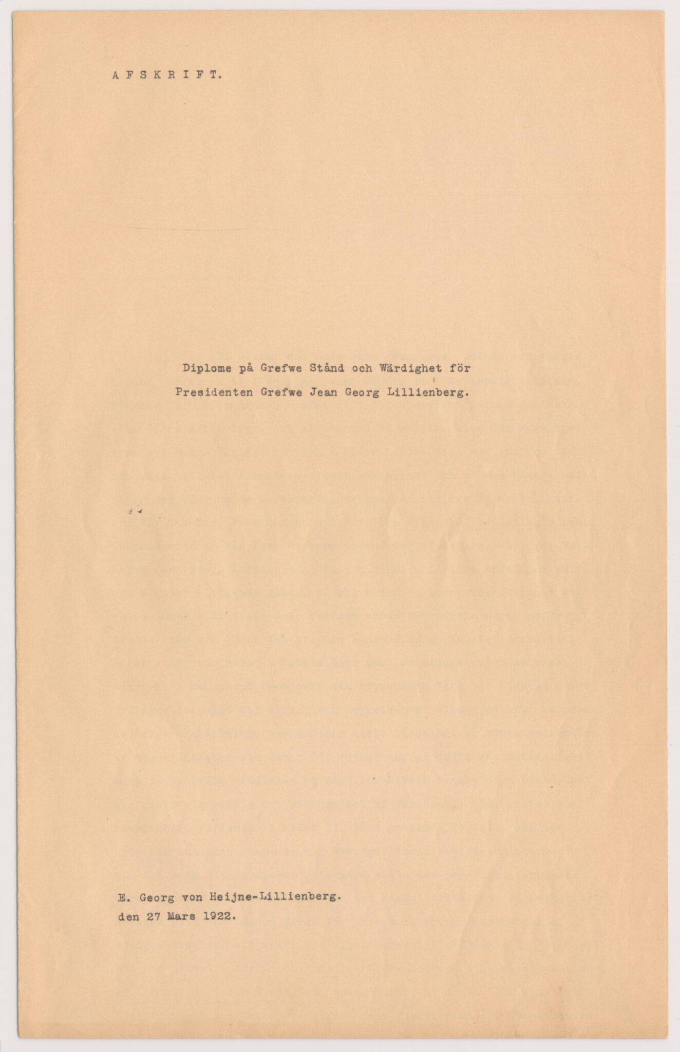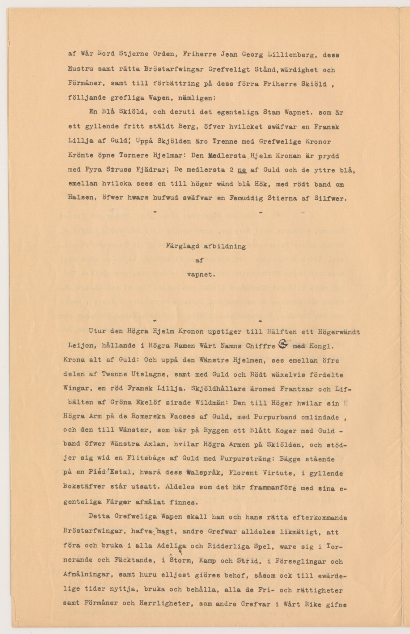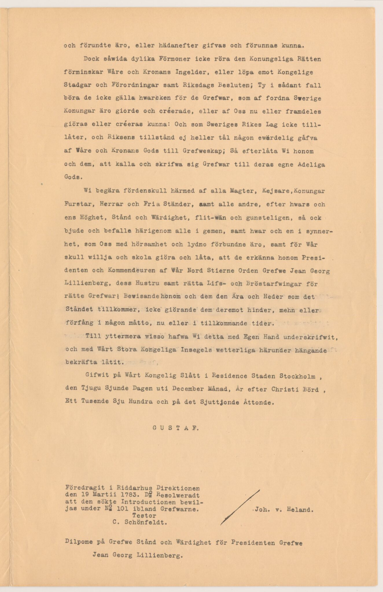 Grevebrevet i original för utdöda grevliga ätten Lillienberg, nr 101.