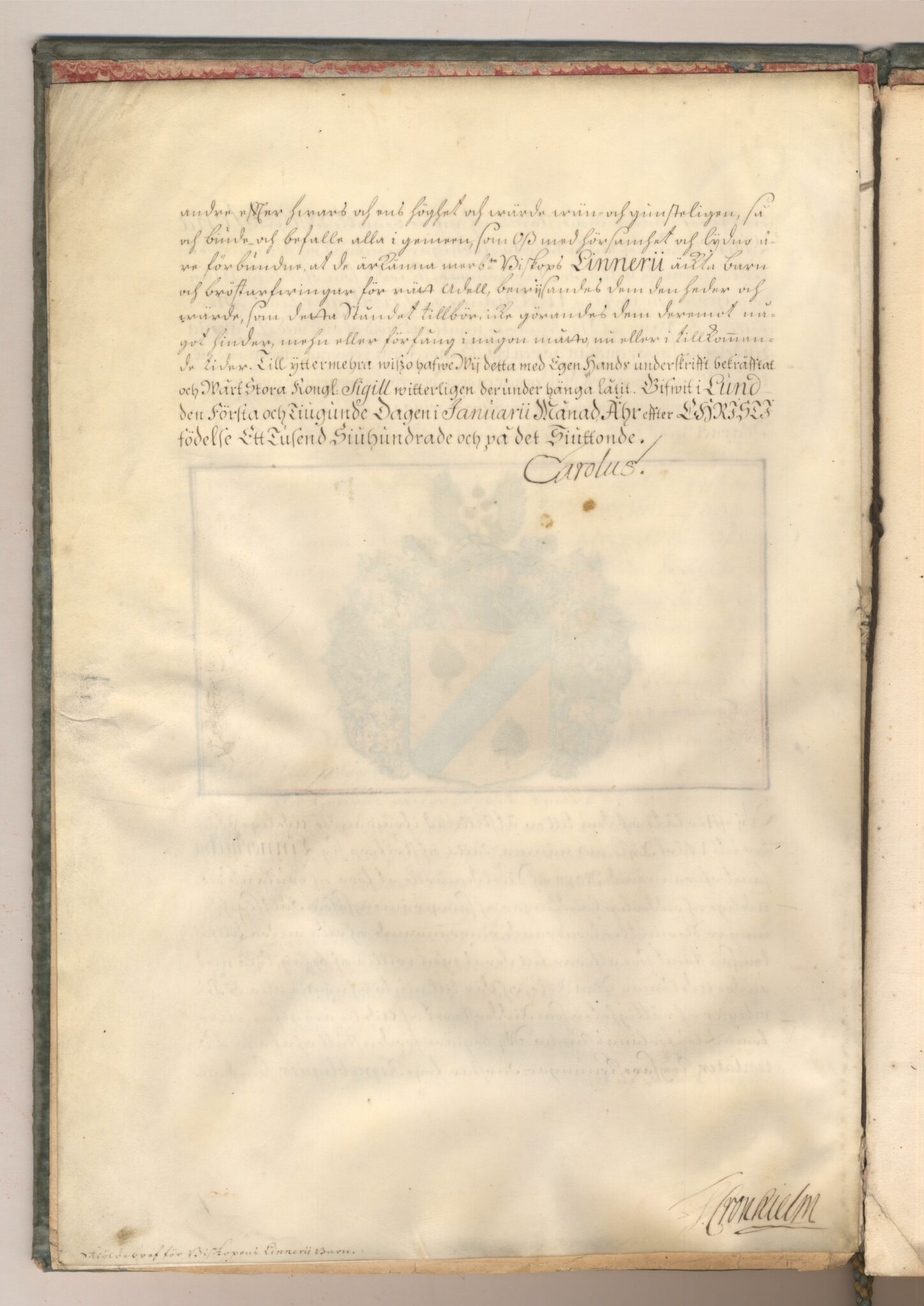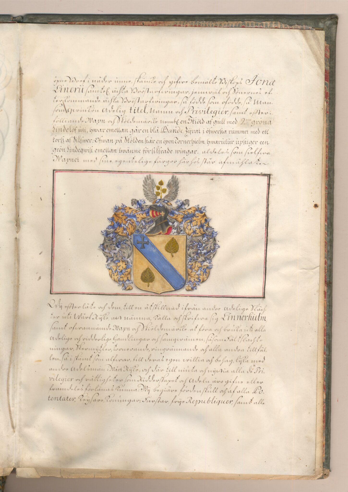 Sköldebrevet i original för utdöda adliga ätten Linnerhielm, nr 1517.