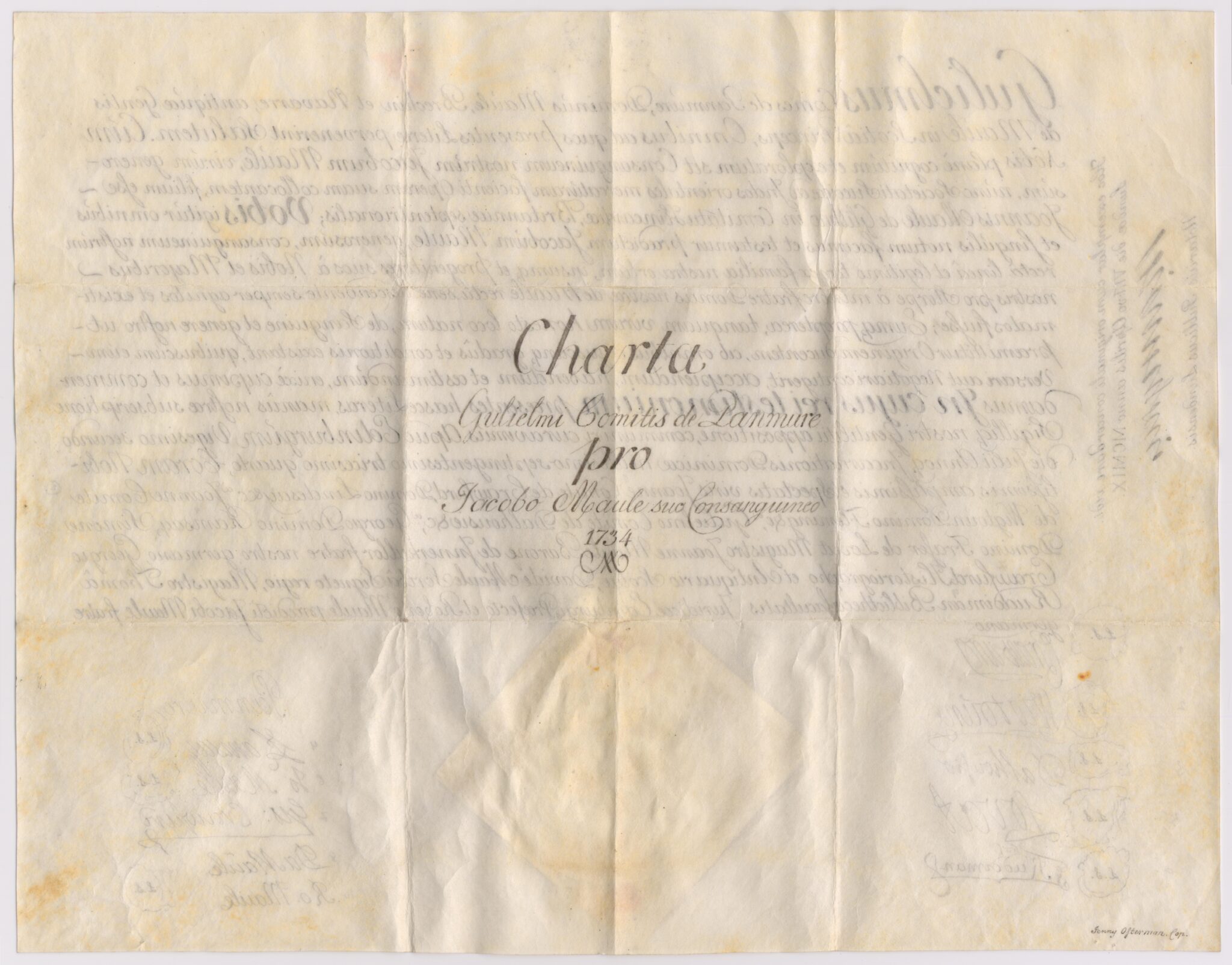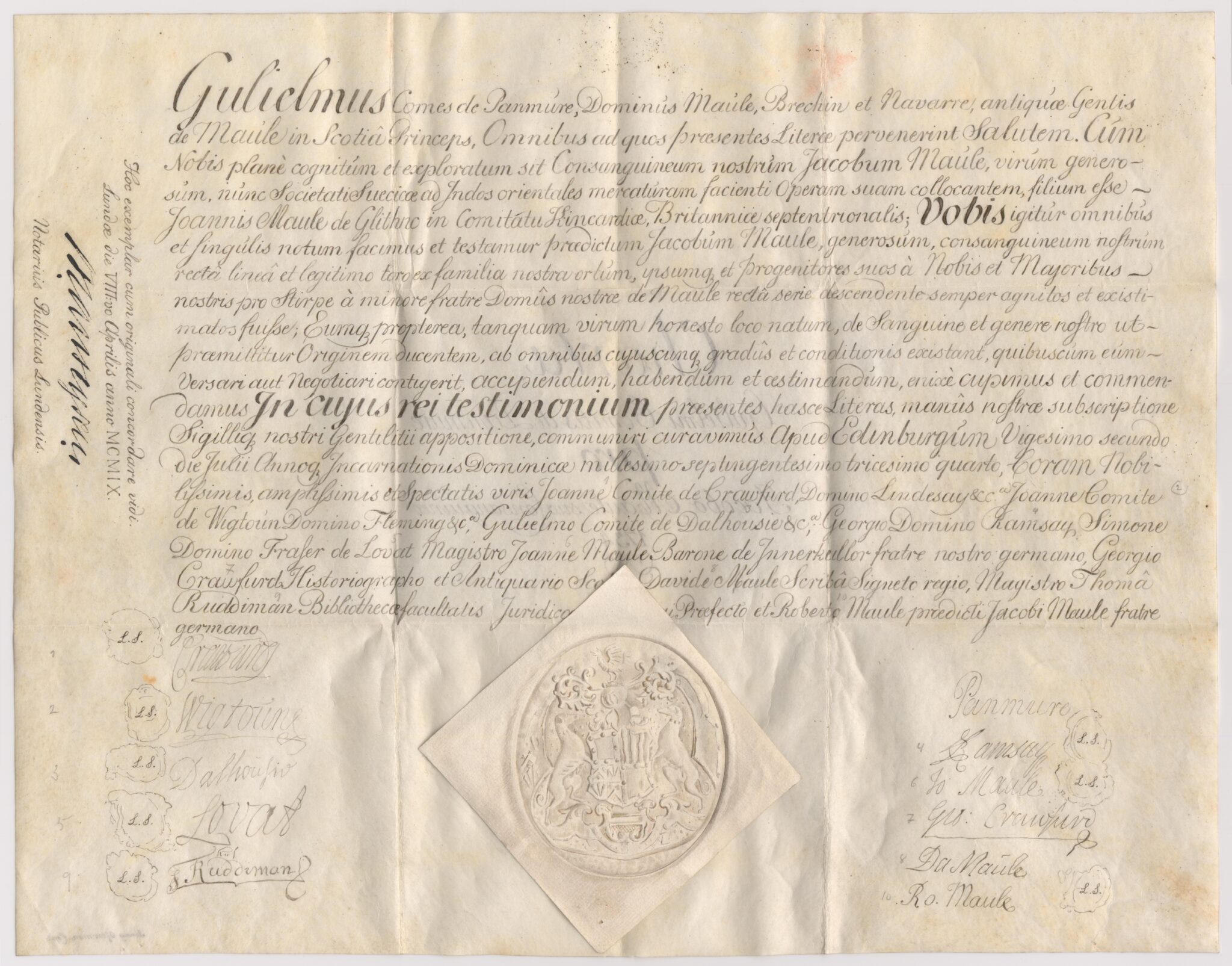Kopia, utförd av Notarius Publicus Lundensis i Lund 1909-04-08, av skotskt intyg på adelskap för Jacob Maule, daterat Edinburgh, 1734-07-22.