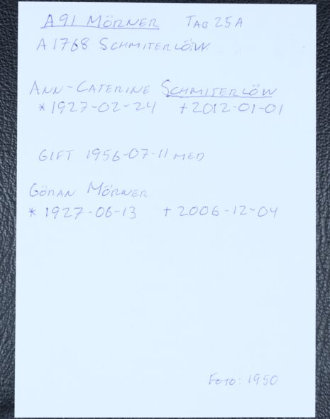 Mörner, Irma ANNE-CATHERINE Charlotta, född Schmiterlöw, nr 1768. Född 1927-02-24. Död 2012-01-01.