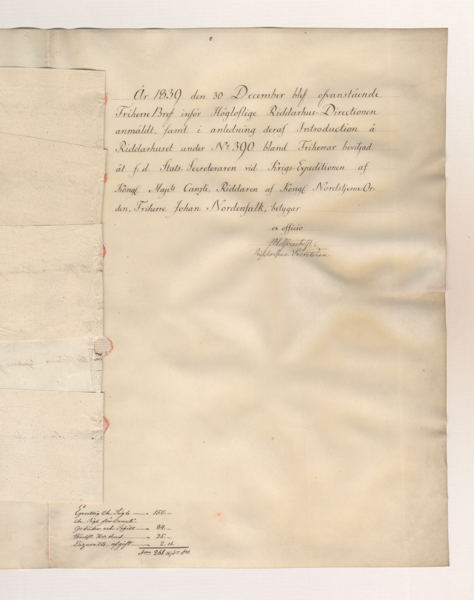 Friherrebrevet i original för friherrliga ätten Nordenfalk, nr 390.