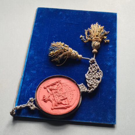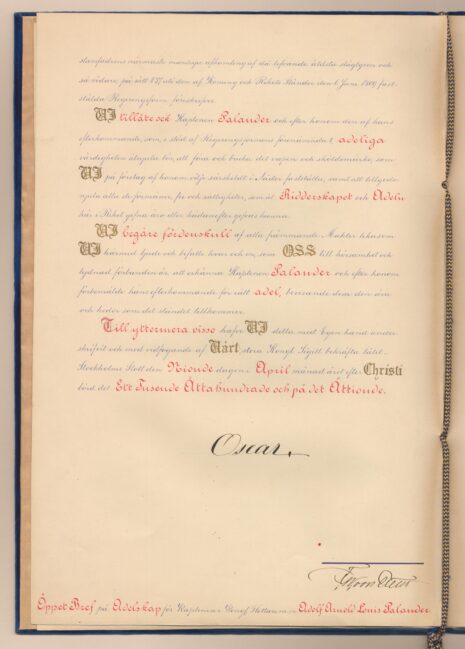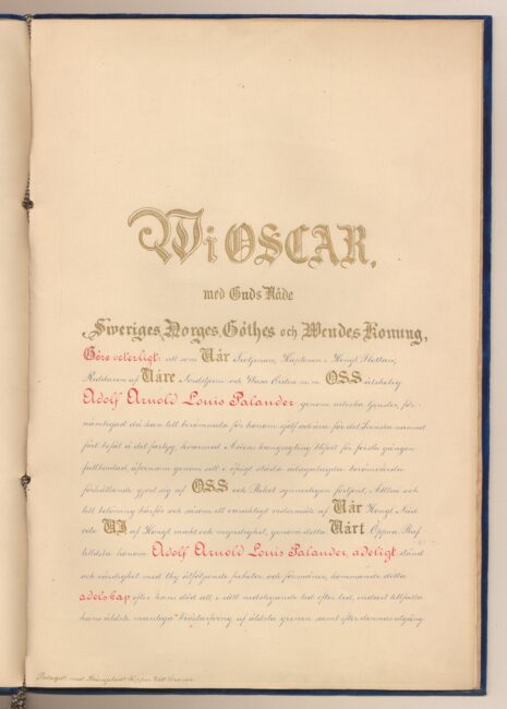 Sköldebrevet i original för utdöda adliga ätten Palander af Vega, nr 2341.