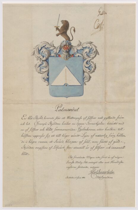 Approberad vapenritning för utdöda adliga ätten Palmsvärd, nr 2224.