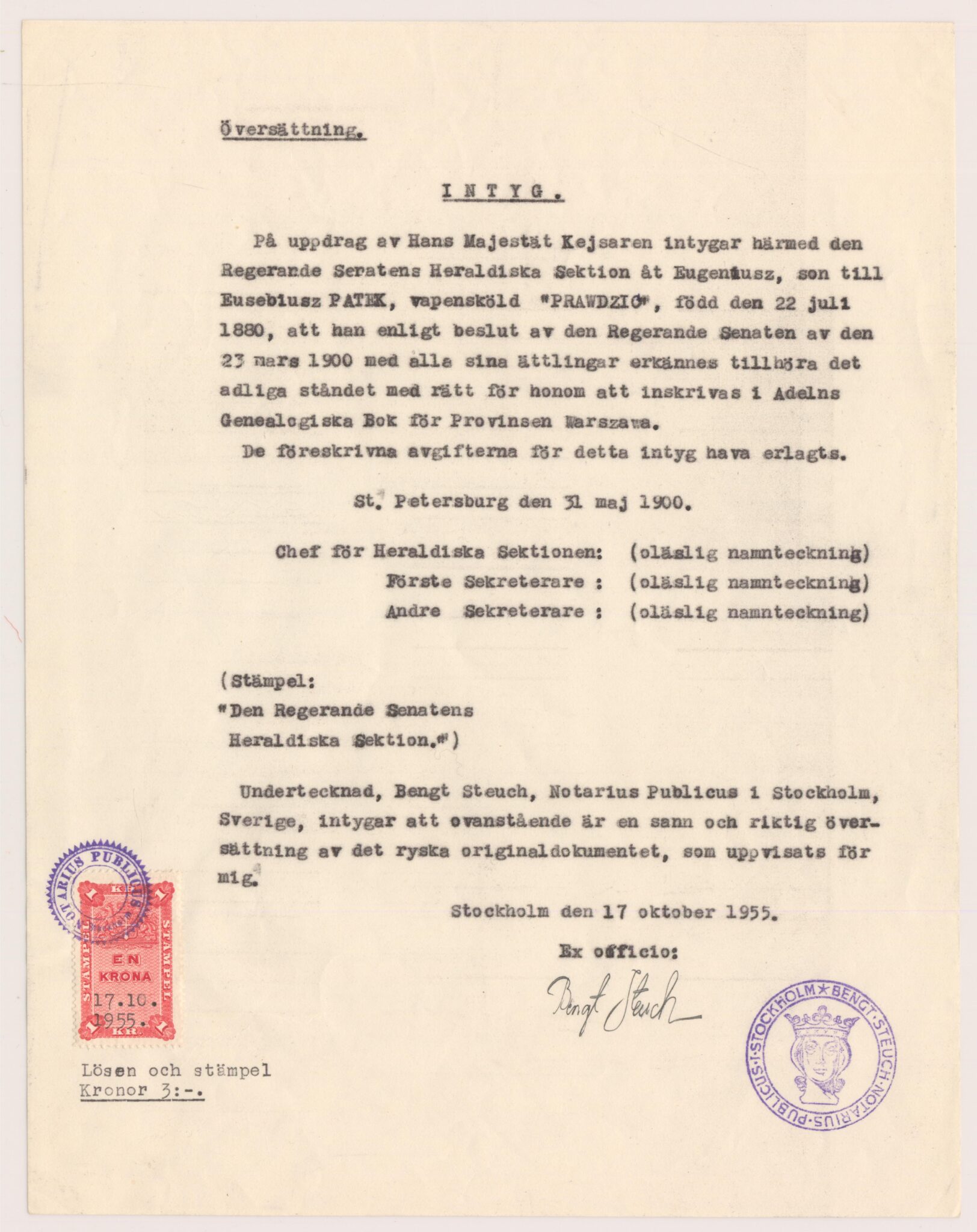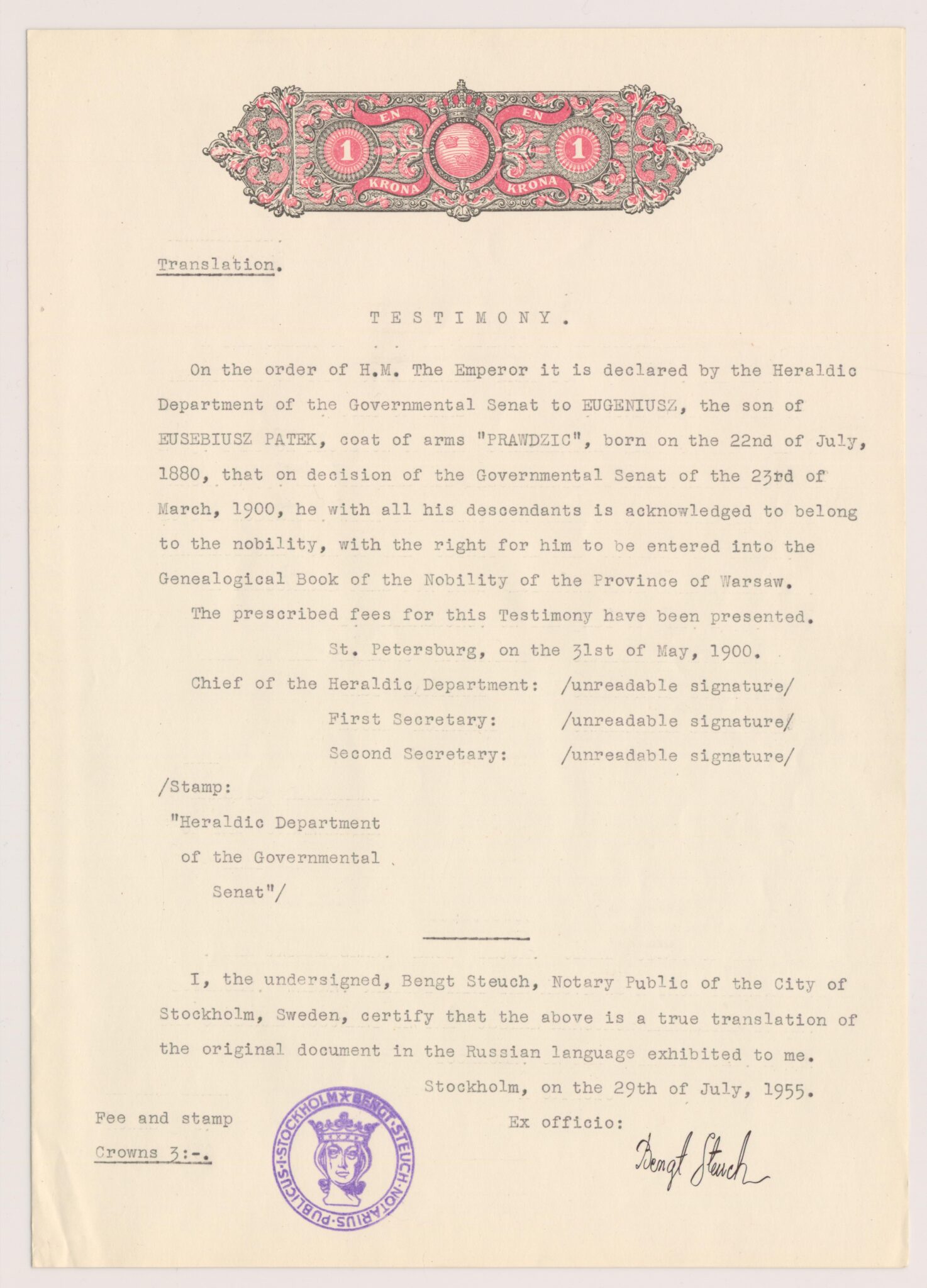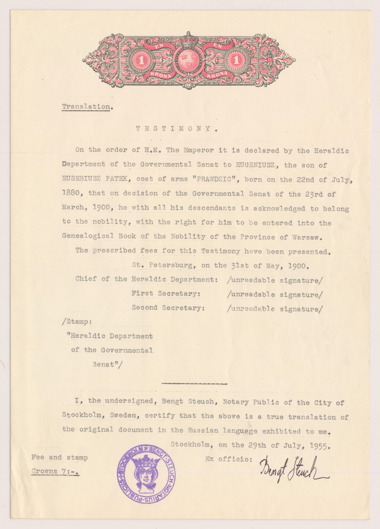 Ryskt senatsdekret, utfärdat i Sankt Petersburg år 1900 på uppdrag av kejsaren, i vilket Eugeniusz Patek bekräftades i sin rättighet till ärftligt adelskap, jämte en av Notarius Publicus i Stockholm vidimerad översättning till svenska och till engelska. Dessutom ett motsvarande dekret för hans fader,