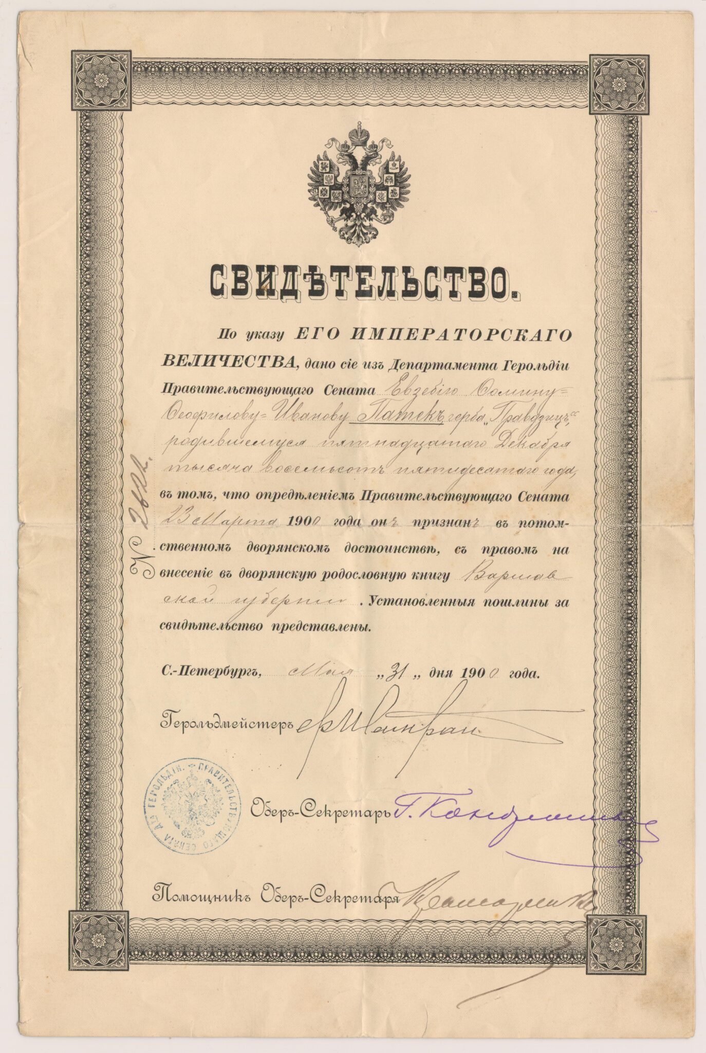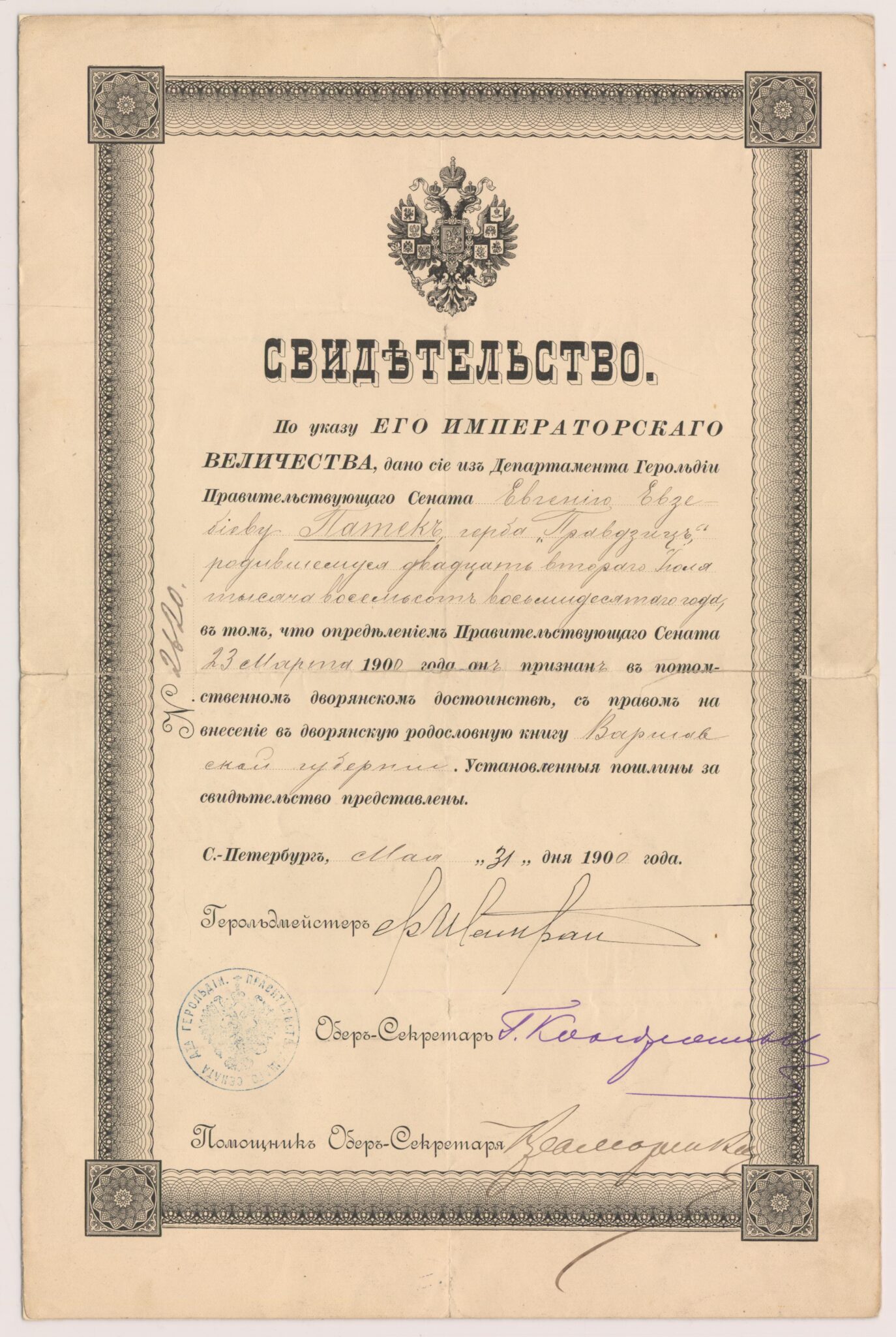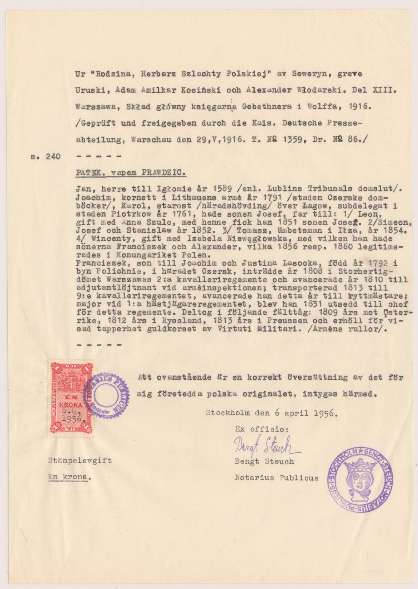 Ryskt senatsdekret, utfärdat i Sankt Petersburg år 1900 på uppdrag av kejsaren, i vilket Eugeniusz Patek bekräftades i sin rättighet till ärftligt adelskap, jämte en av Notarius Publicus i Stockholm vidimerad översättning till svenska och till engelska. Dessutom ett motsvarande dekret för hans fader,