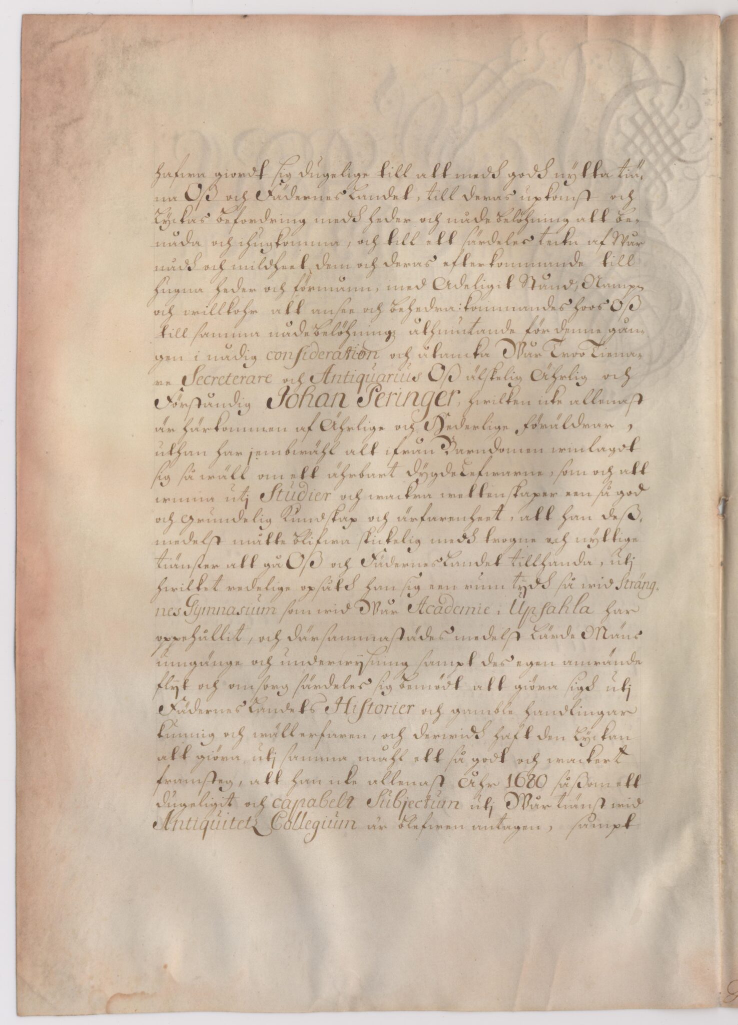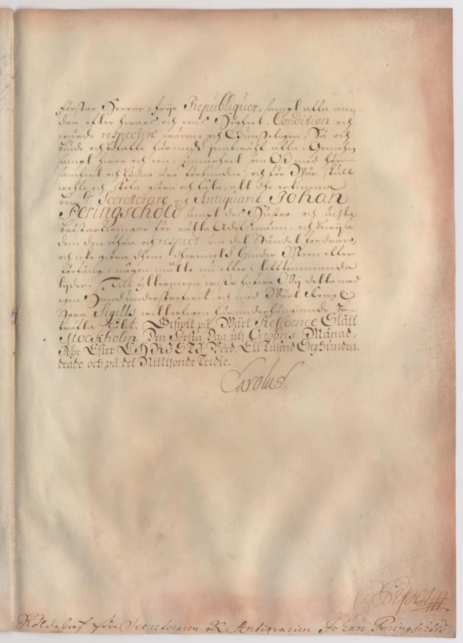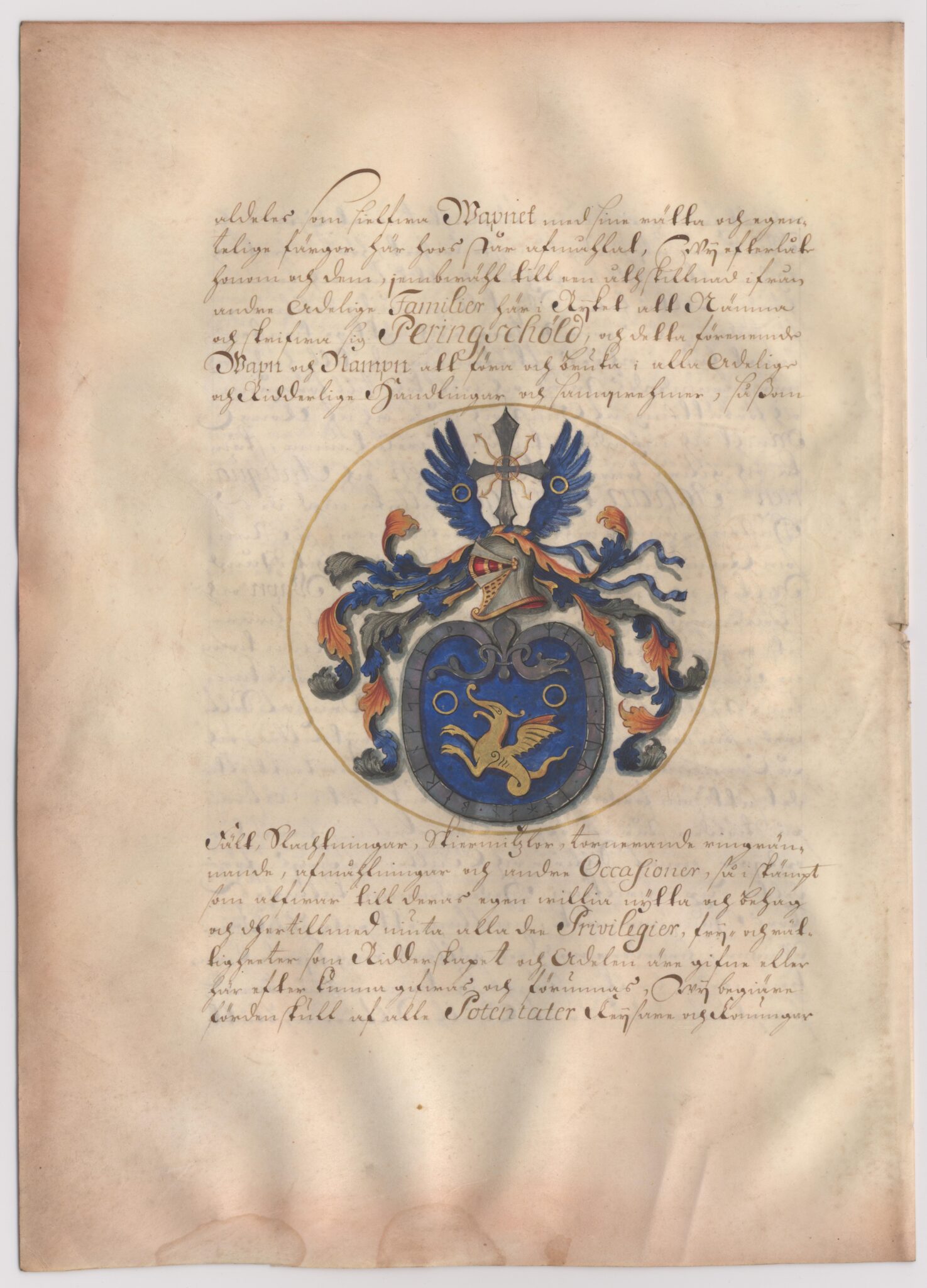 Sköldebrevet i original för utdöda adliga ätten Peringskiöld, nr 1273.