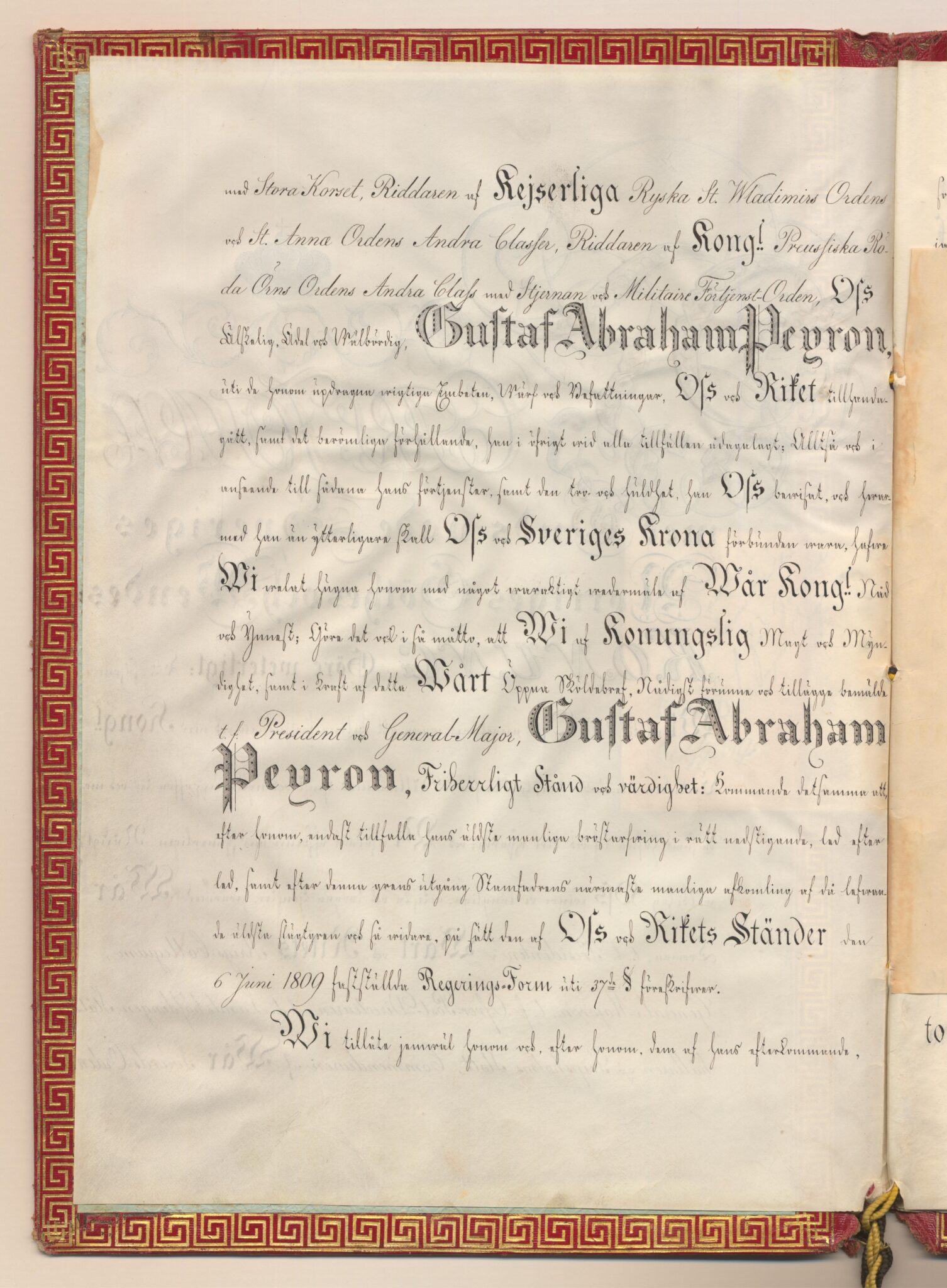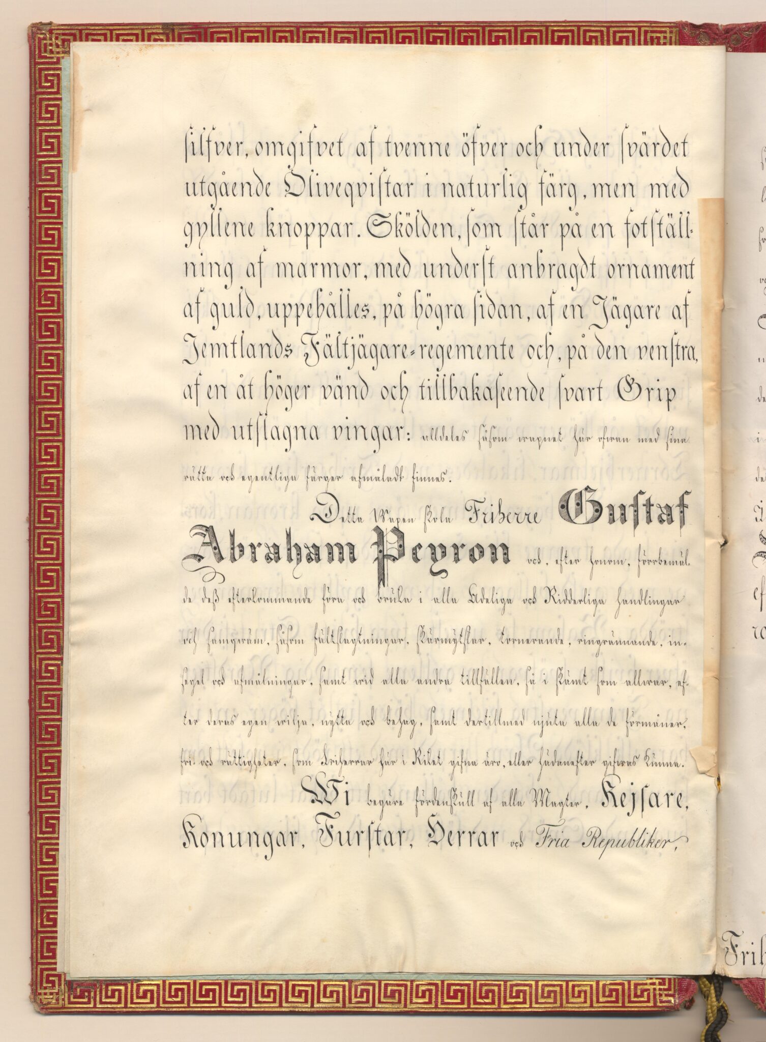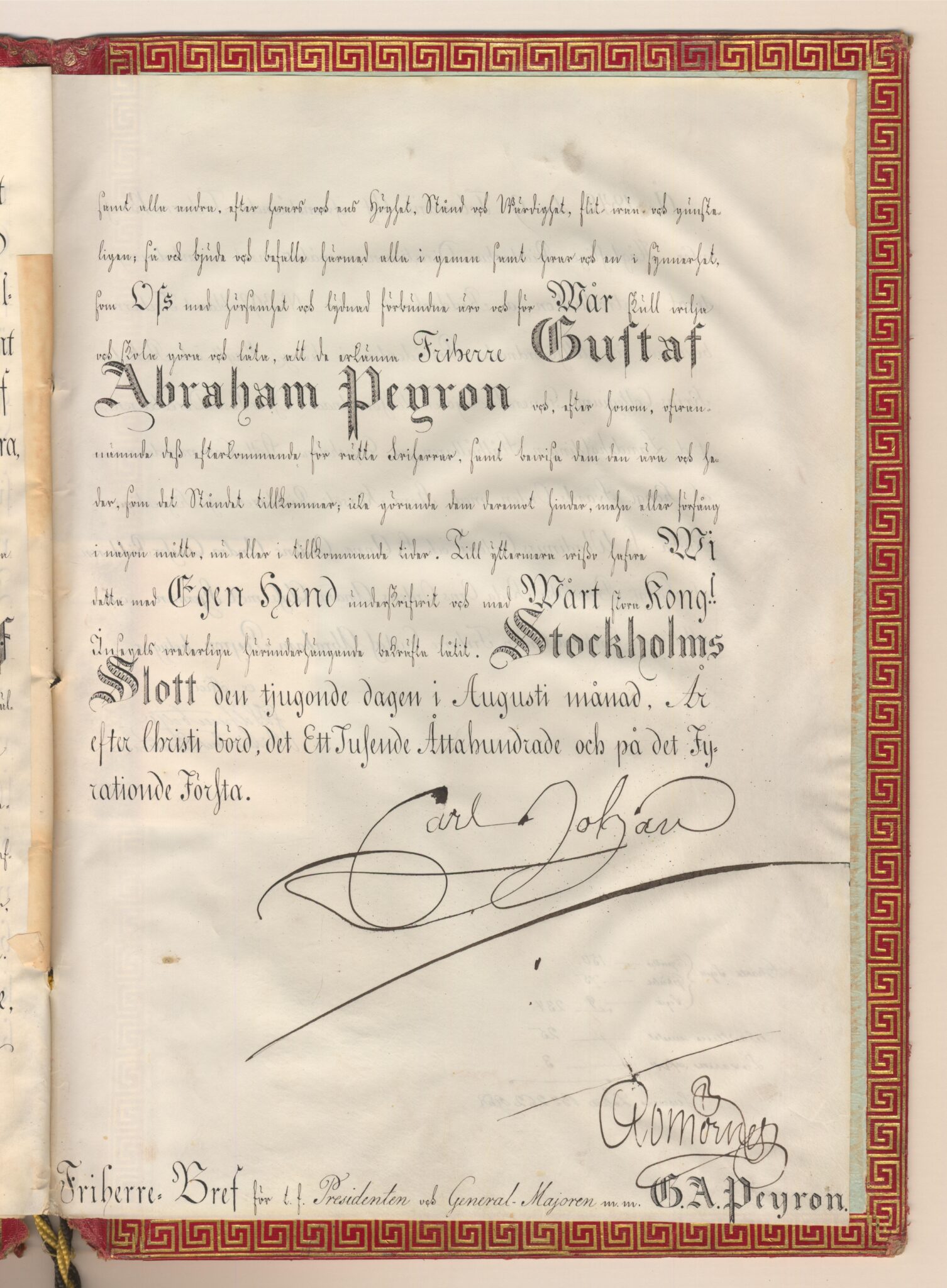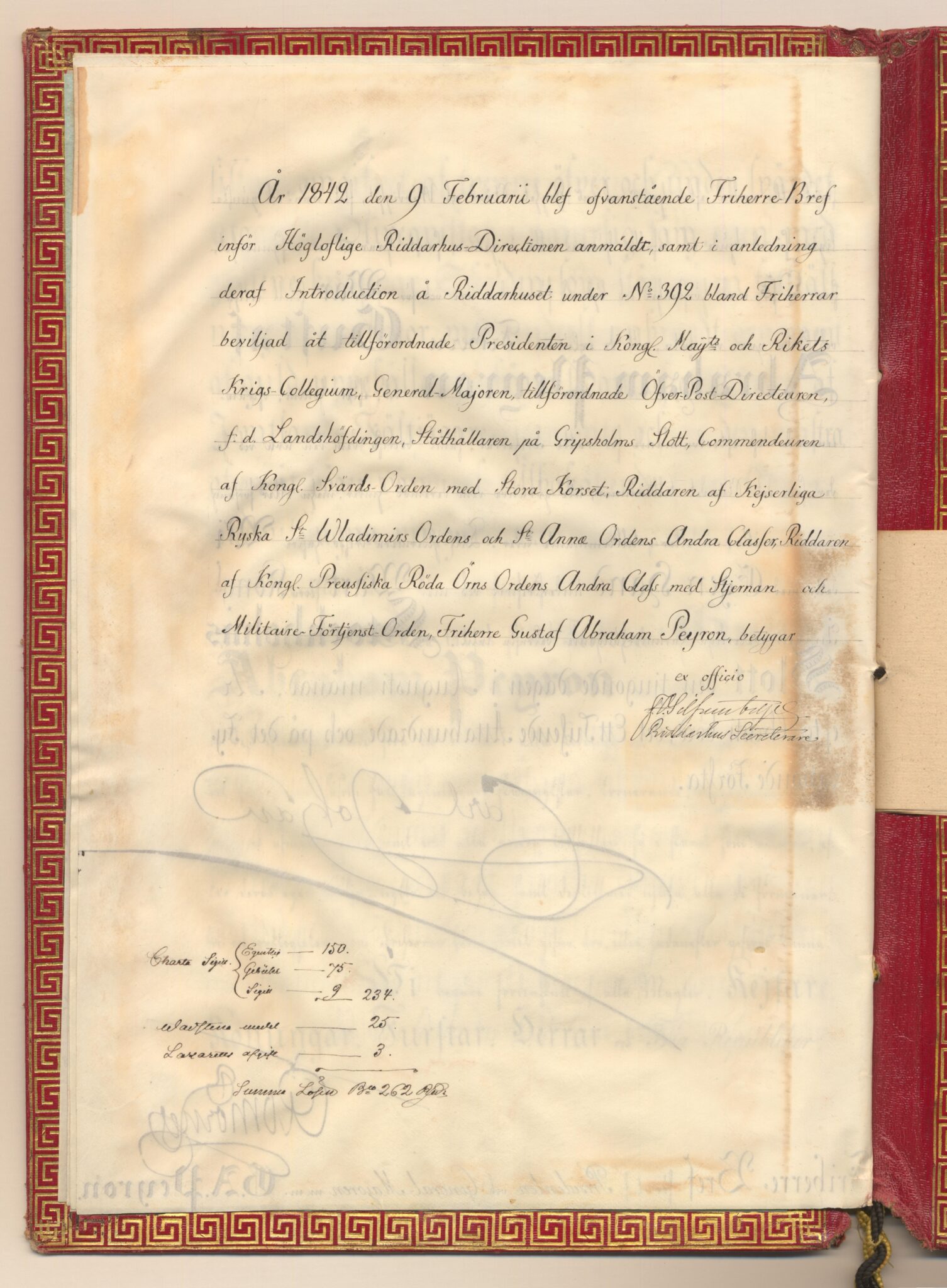 Friherrebrevet i original för friherrliga ätten Peyron, nr 392.