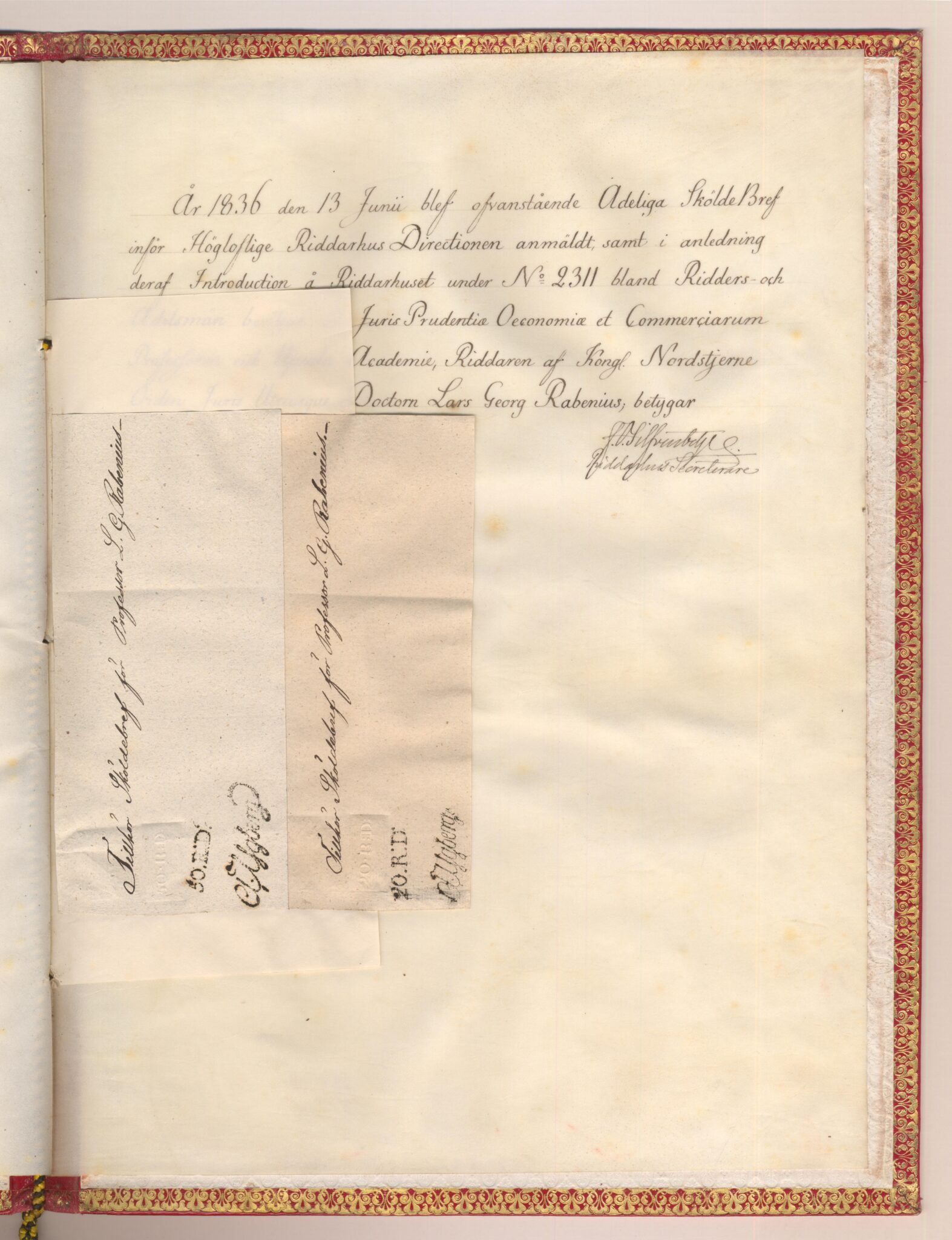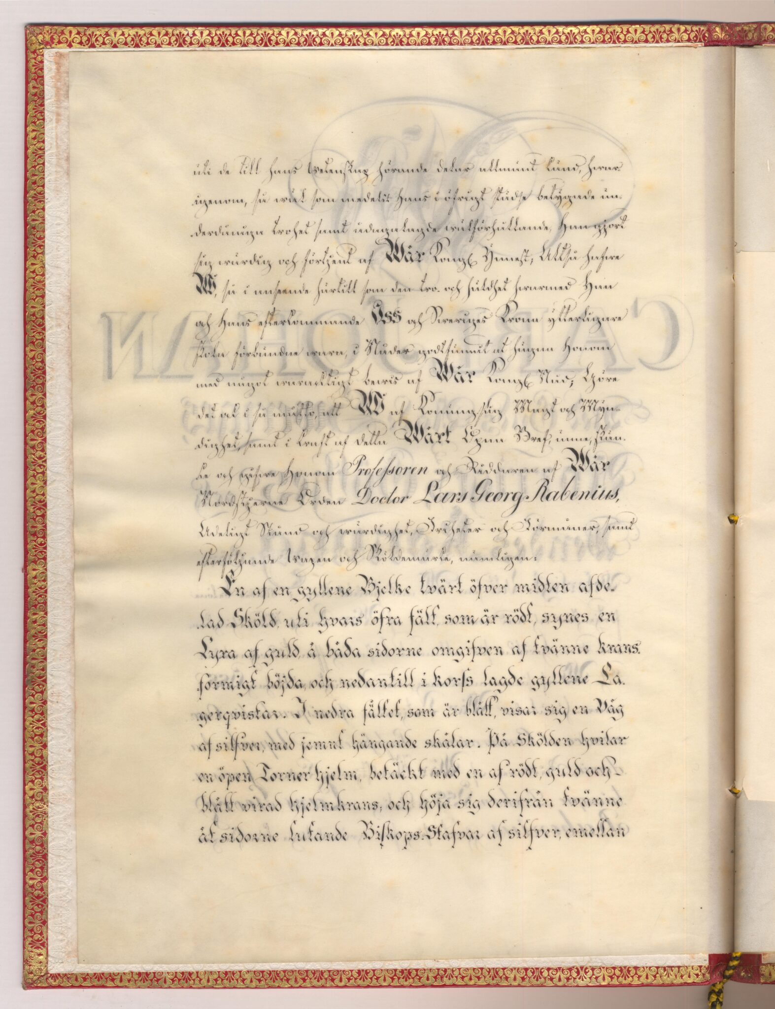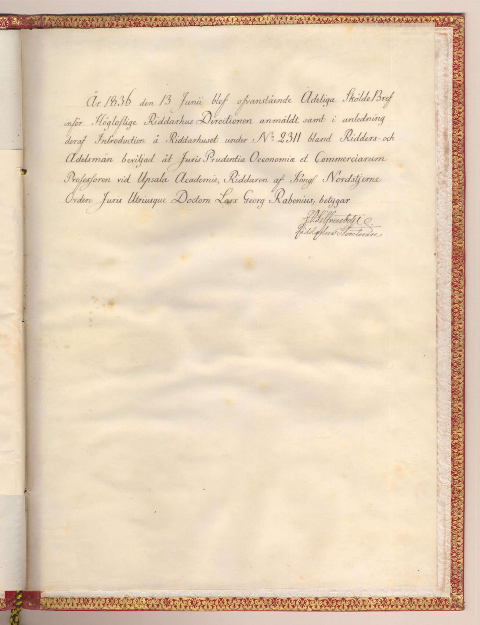Sköldebrevet i original för adliga ätten Rabenius, nr 2311.