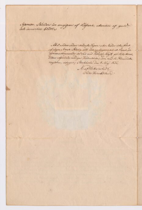 Utförd: Riksheraldiker Niklas Joakim af Wetterstedt, Stockholm, 1836-05-04.