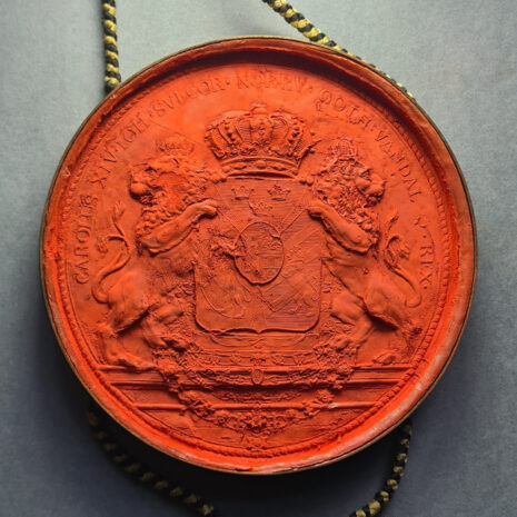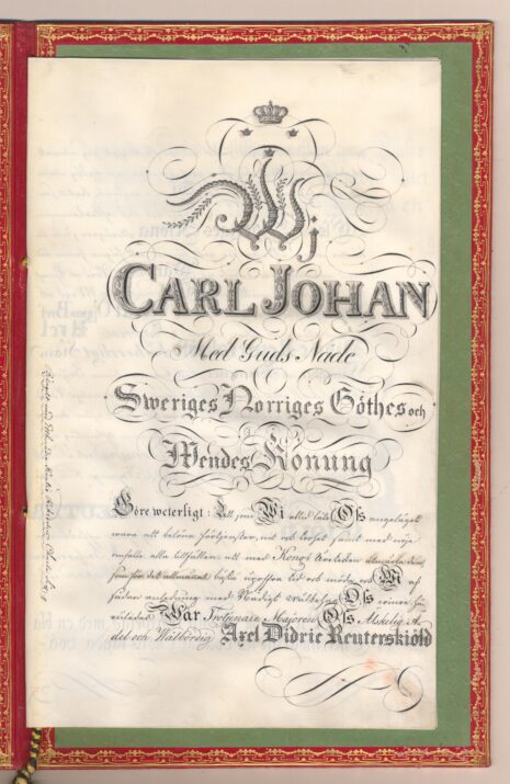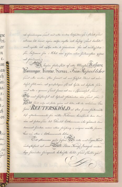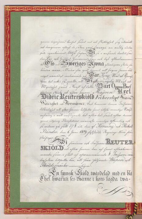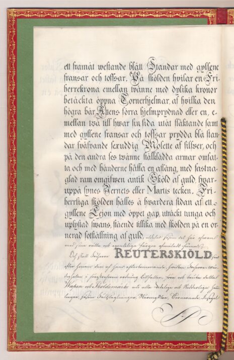 Friherrebrevet i original för friherrliga ätten Reuterskiöld, nr 377.