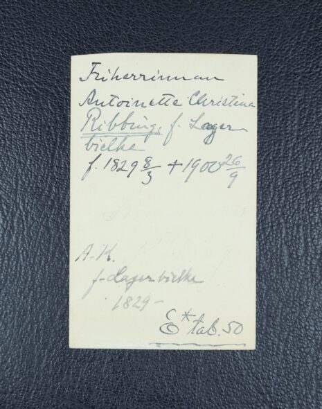 Ribbing, ANTOINETTE, född friherrinna Lagerbielke, nr 254. Född 1829-03-08. Död 1900-09-26.