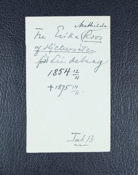 Roos af Hjelmsäter, ERIKA Mathilda, född Lindeberg. Född 1854-11-12. Död 1875-11-14.