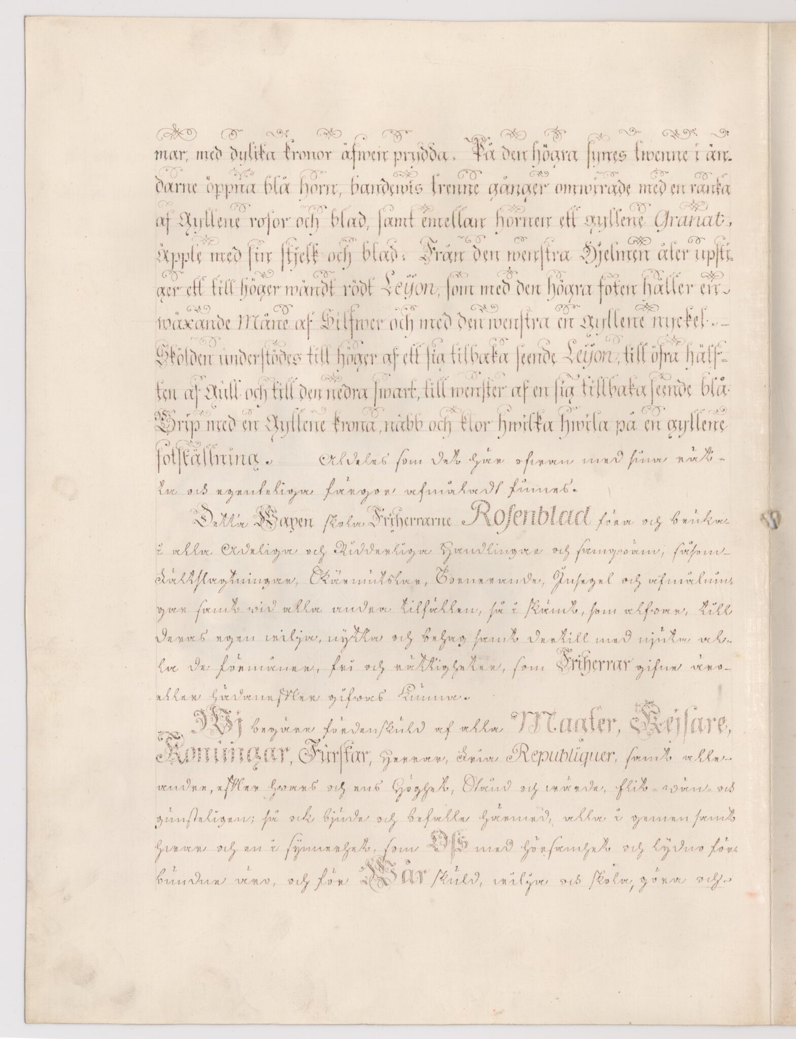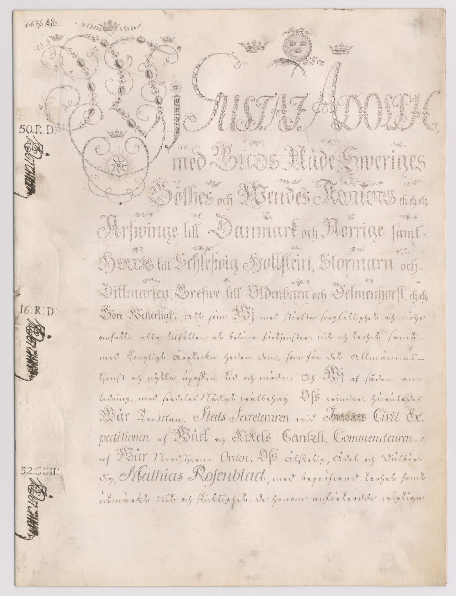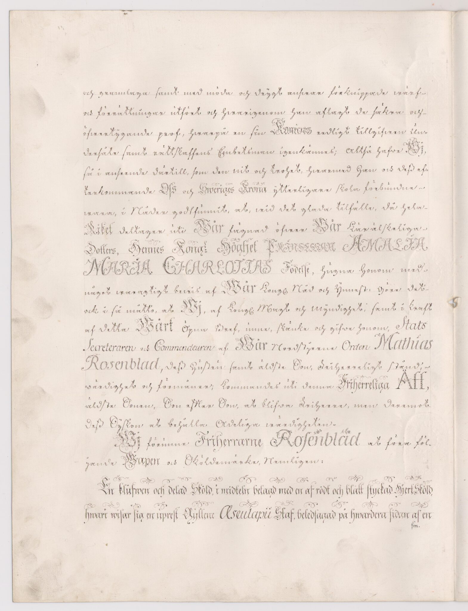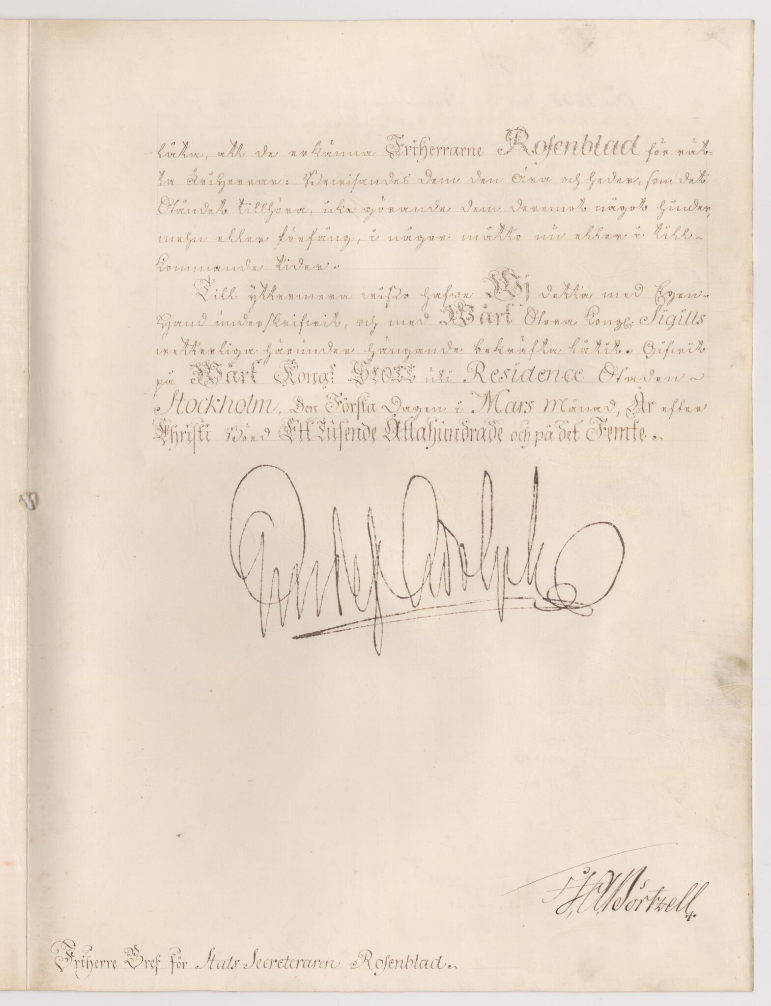 Friherrebrevet i original för friherrliga ätten Rosenblad, nr 323.