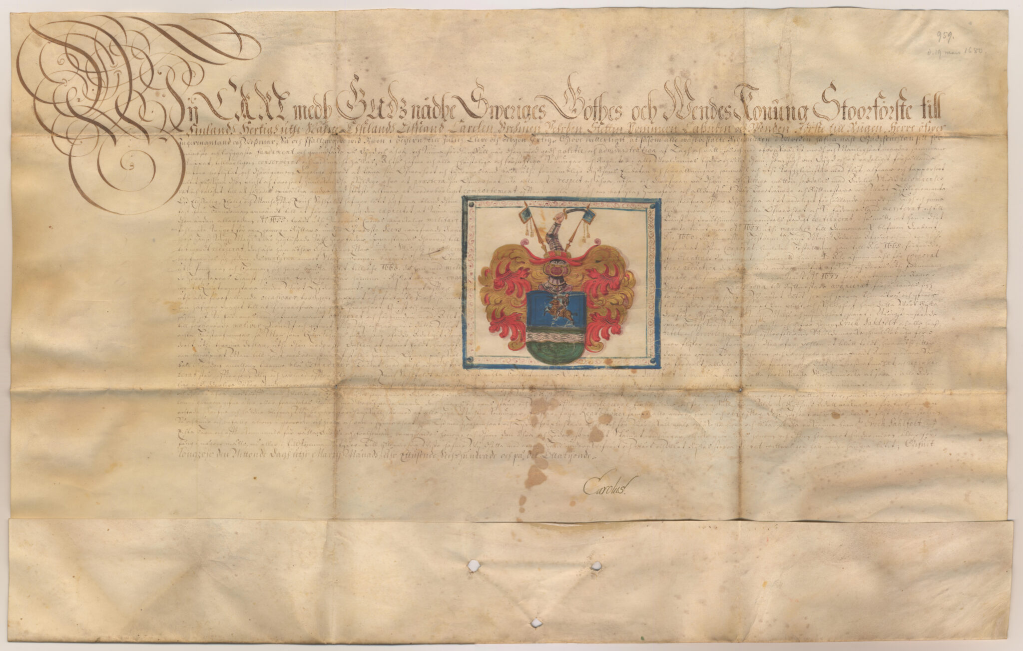 Sköldebrevet i original för utdöda adliga ätten Sahlefelt, nr 959.