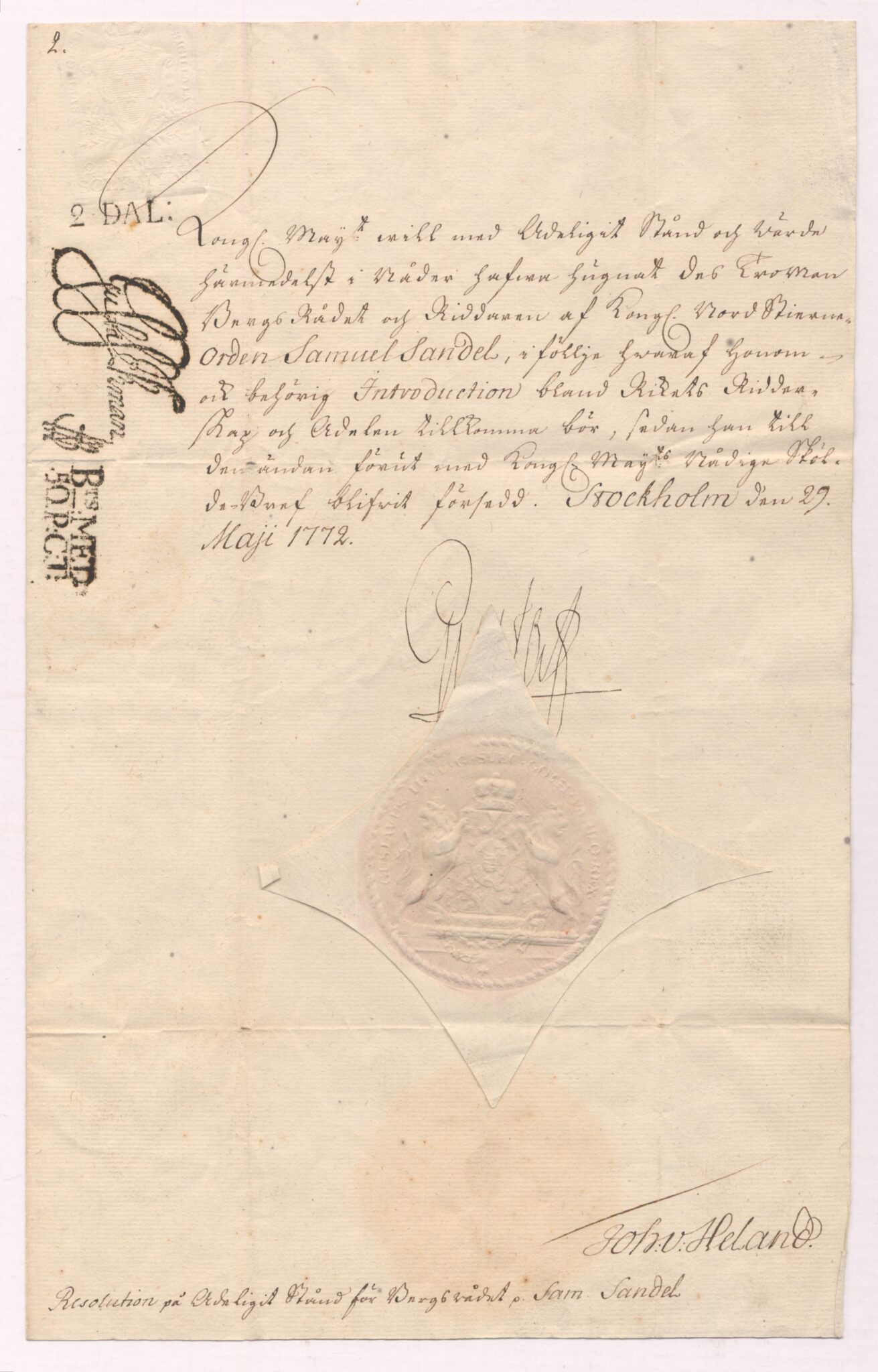 Utnämnd och utfärdat: Gustav III, Stockholms slott, 1772-05-29.