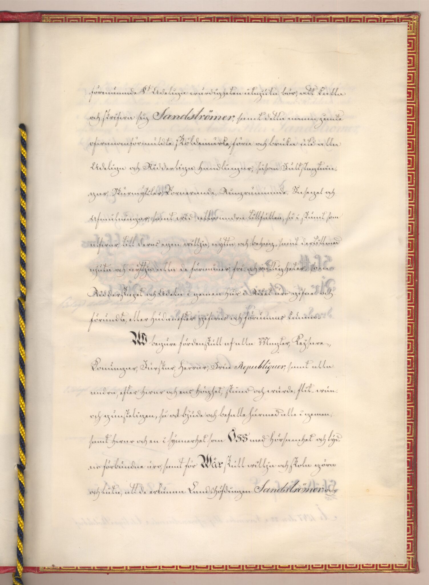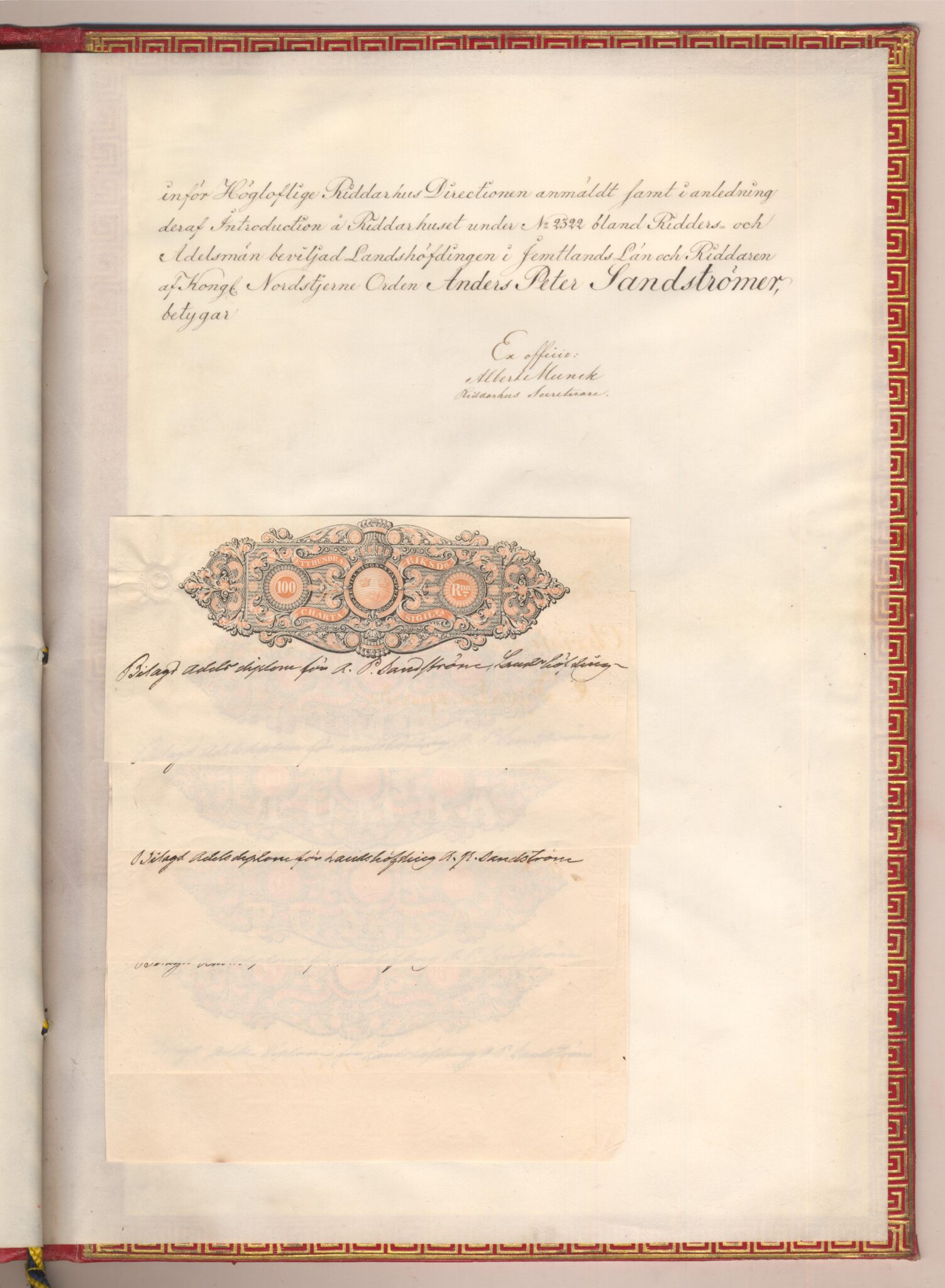 Sköldebrevet i original för utdöda adliga ätten Sandströmer, nr 2322.