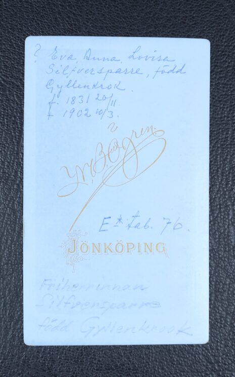Silfversparre, EVA Anna Lovisa, född friherrinna Gyllenkrok, nr 195. Född 1831-11-20. Död 1902-03-10.