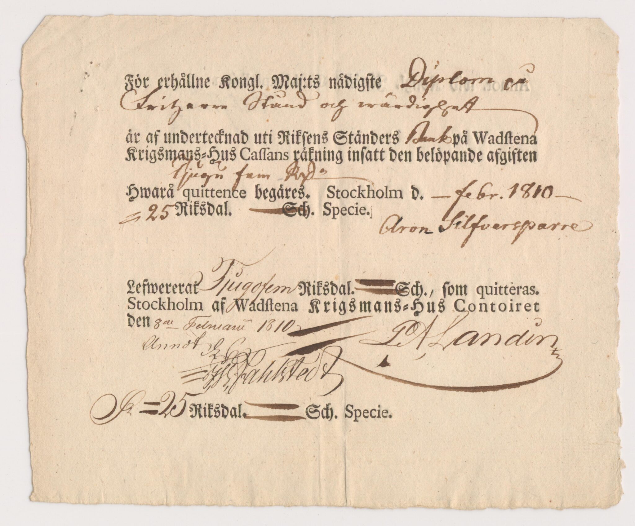 1. Kvittens, Vadstena krigsmanshus, 1810-02-08, baksida.jpg