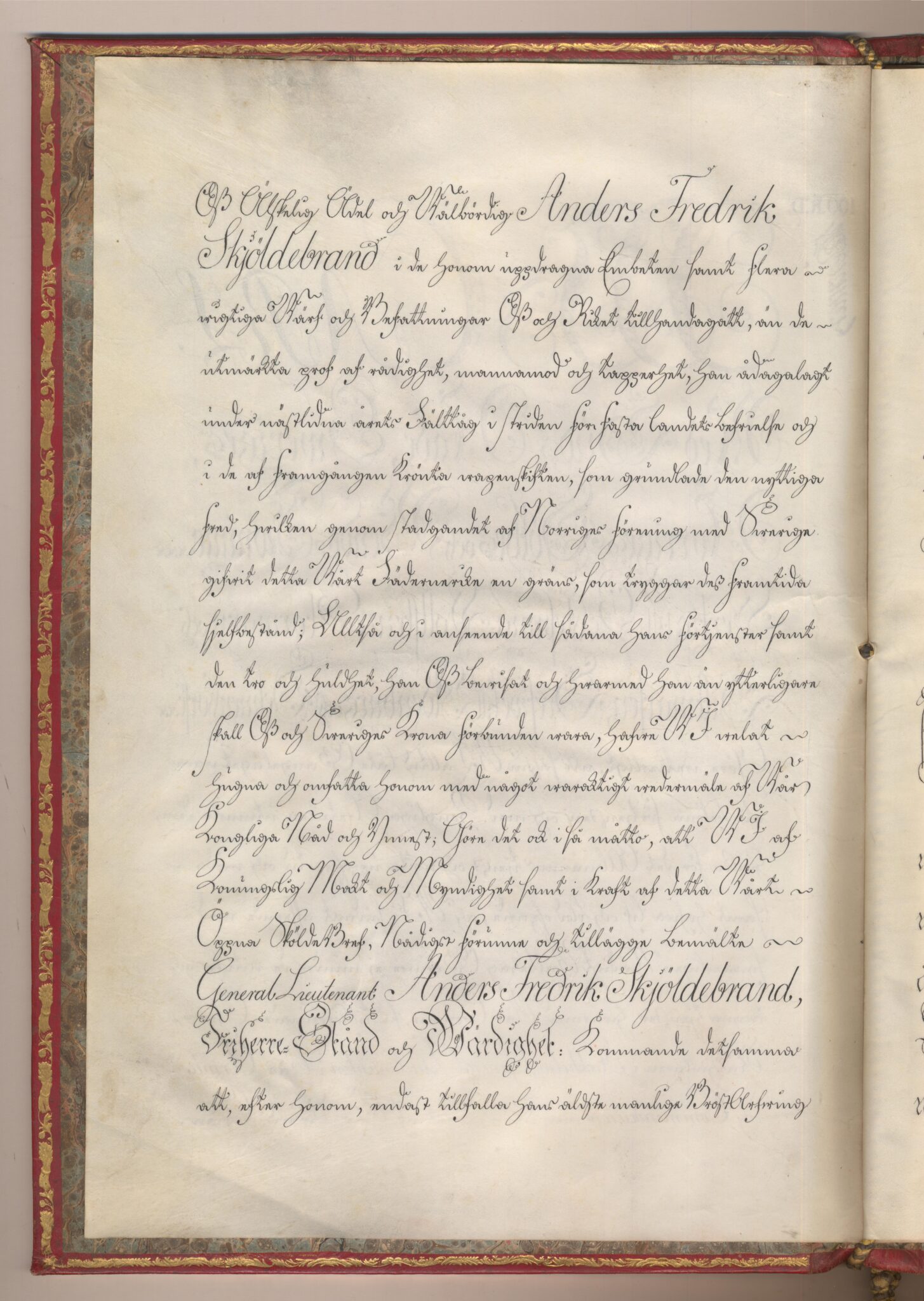Friherrebrevet i original för utdöda friherrliga ätten Skjöldebrand, nr 345.