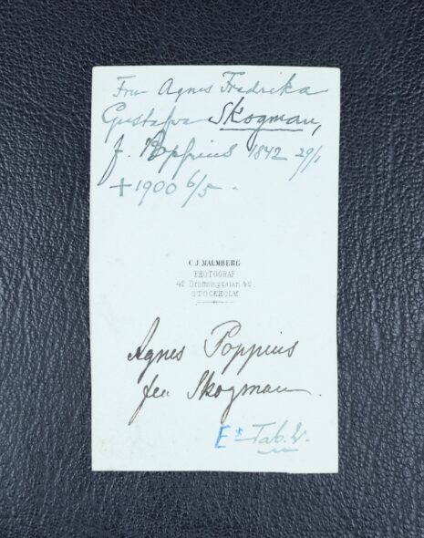 Skogman, AGNES Fredrika Gustava, född Poppius. Född 1842-01-29. Död 1900-05-06.