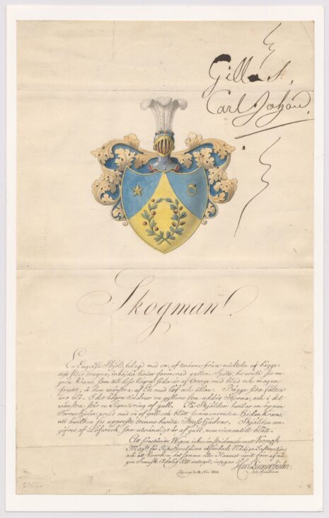Approberad vapenritning för utdöda adliga ätten Skogman, nr 2302.