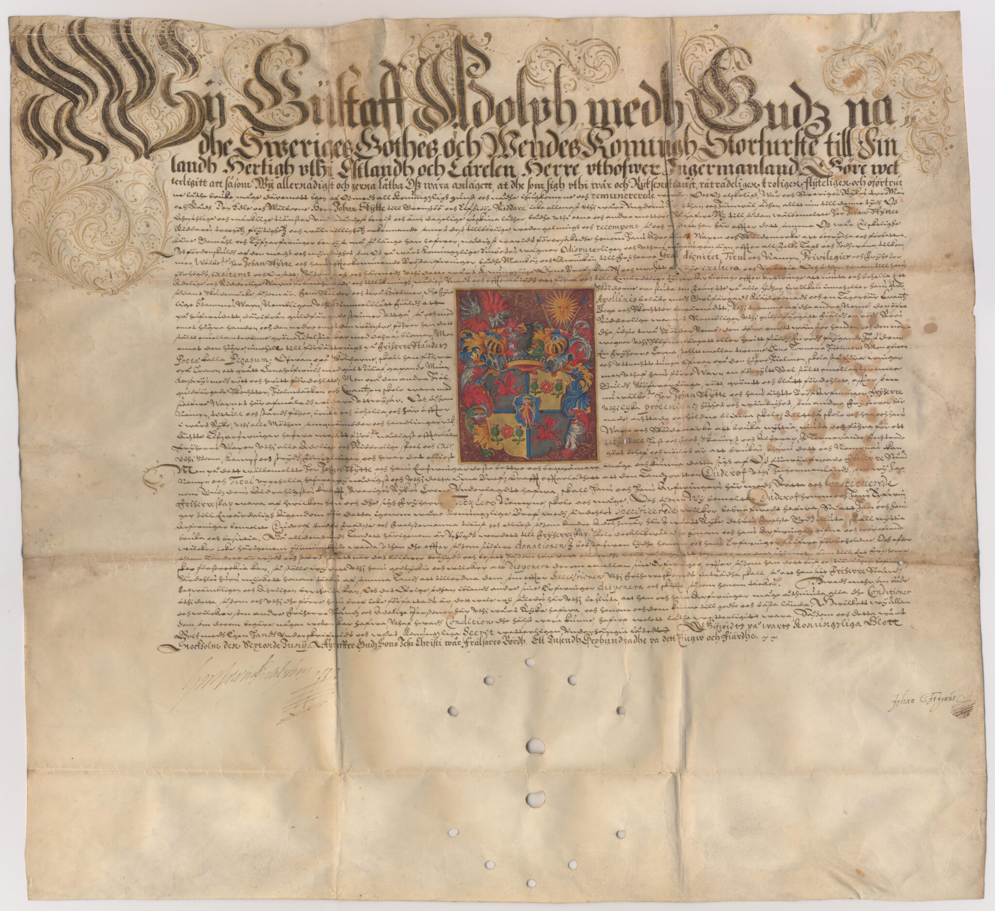 Friherrebrevet i original för utdöda friherrliga ätten Skytte af Duderhof, nr 8.