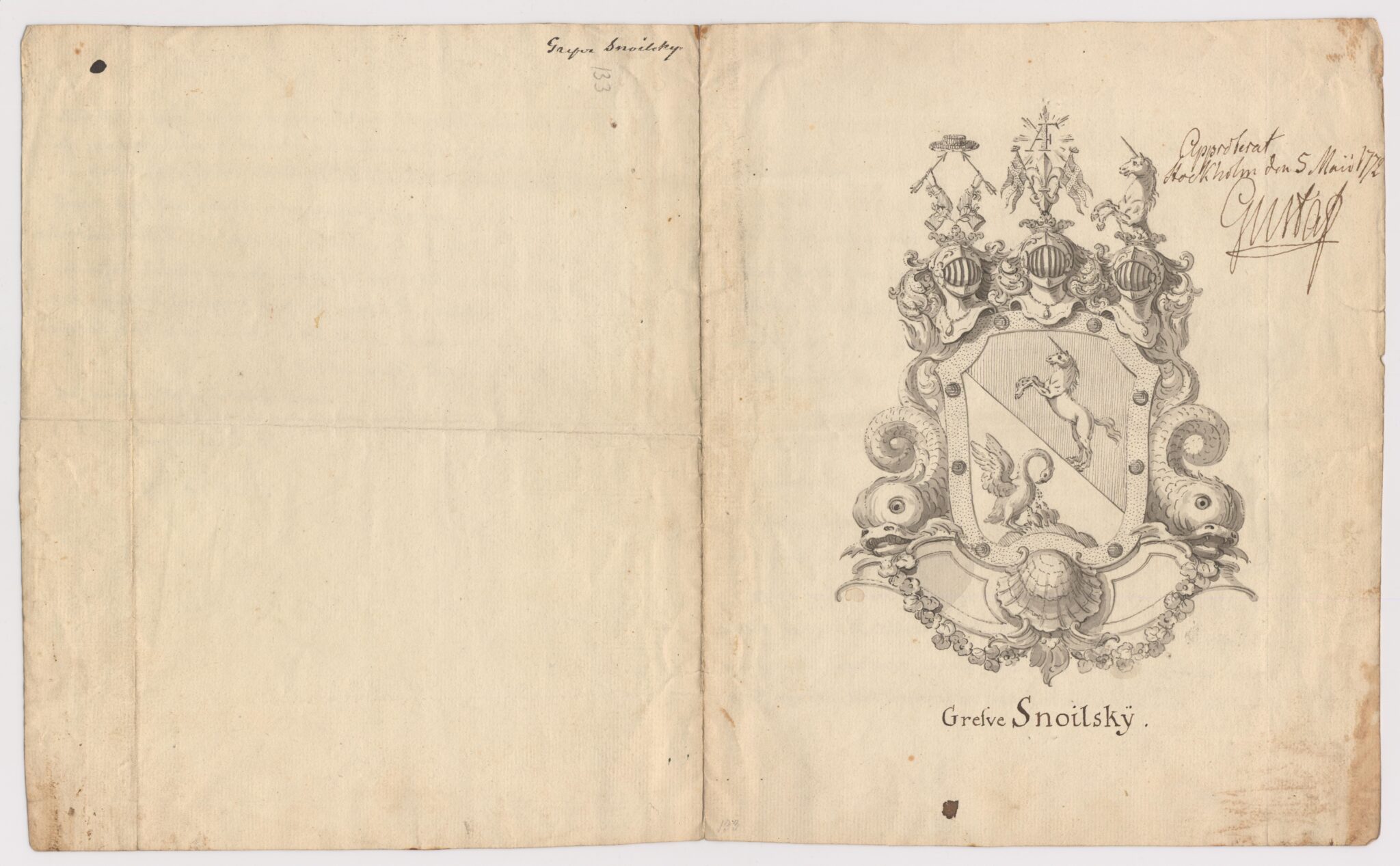 Approberad vapenritning för utdöda grevliga ätten Snoilsky, nr 133.