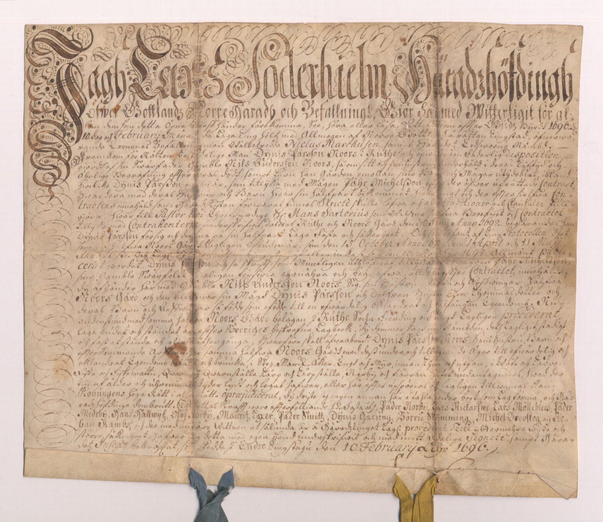 Äganderättshandling utfärdad 1696 av Häradshövding Lars Söderhielm angående Nors gård i Rute socken, Gotland.