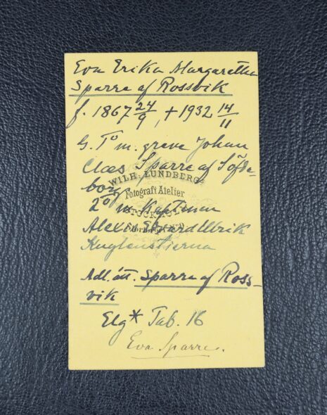 Sparre af Rossvik, EVA Erika Margareta, gift 1:o grevinna Sparre af Söfdeborg, nr 66, gift 2:o Kuylenstierna, nr 1304. Född 1867-09-24. Död 1932-11-14.