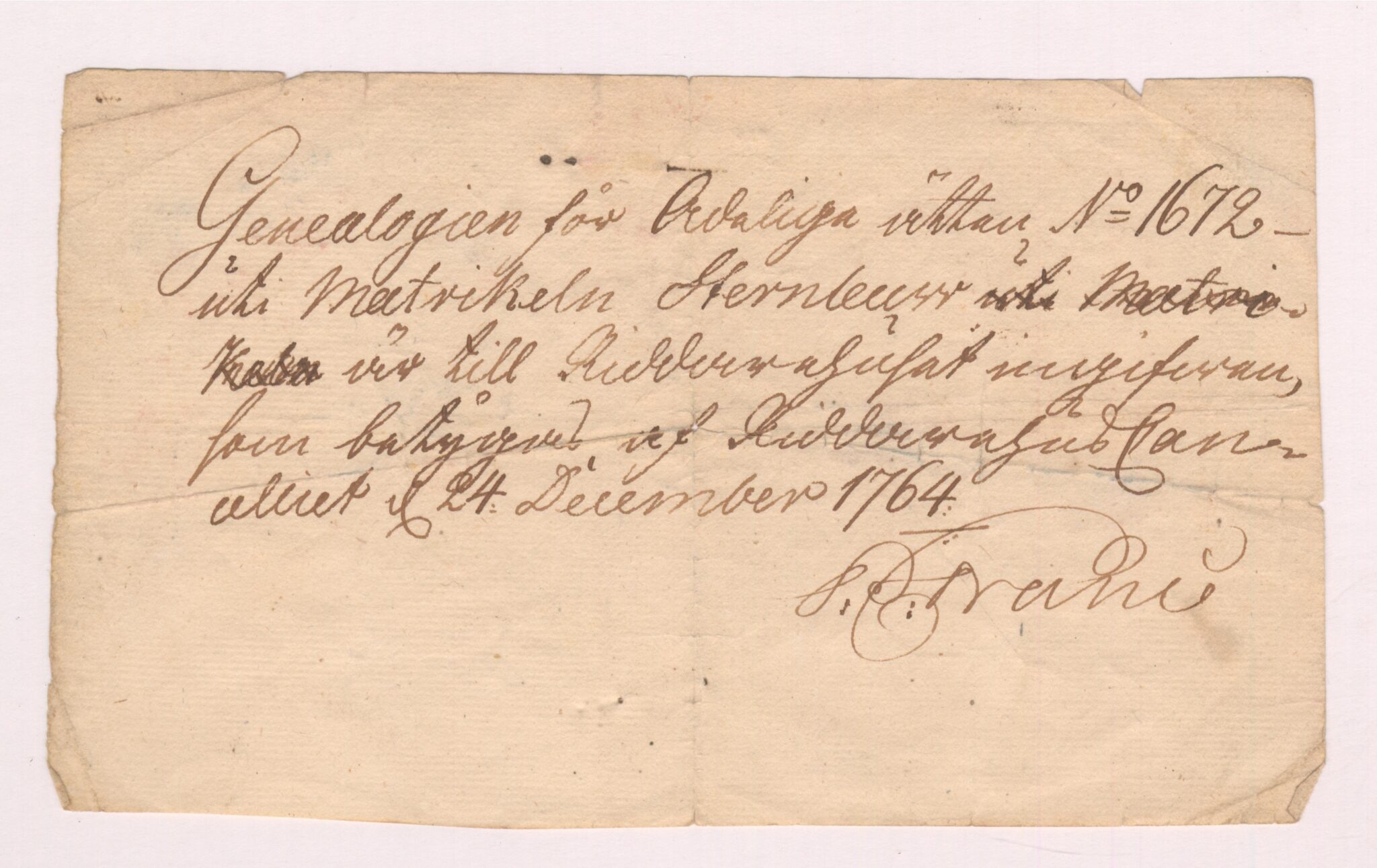 1. Kvittens, ingiven genealogi, 1764-12-24.