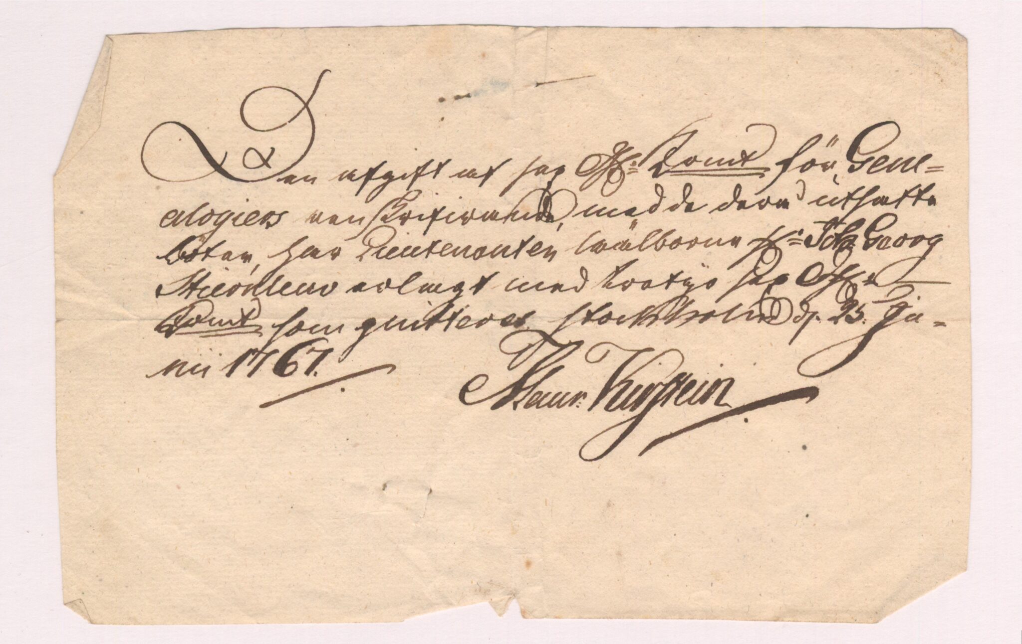 2. Kvittens, avgift genealogi, 1767-01-25.