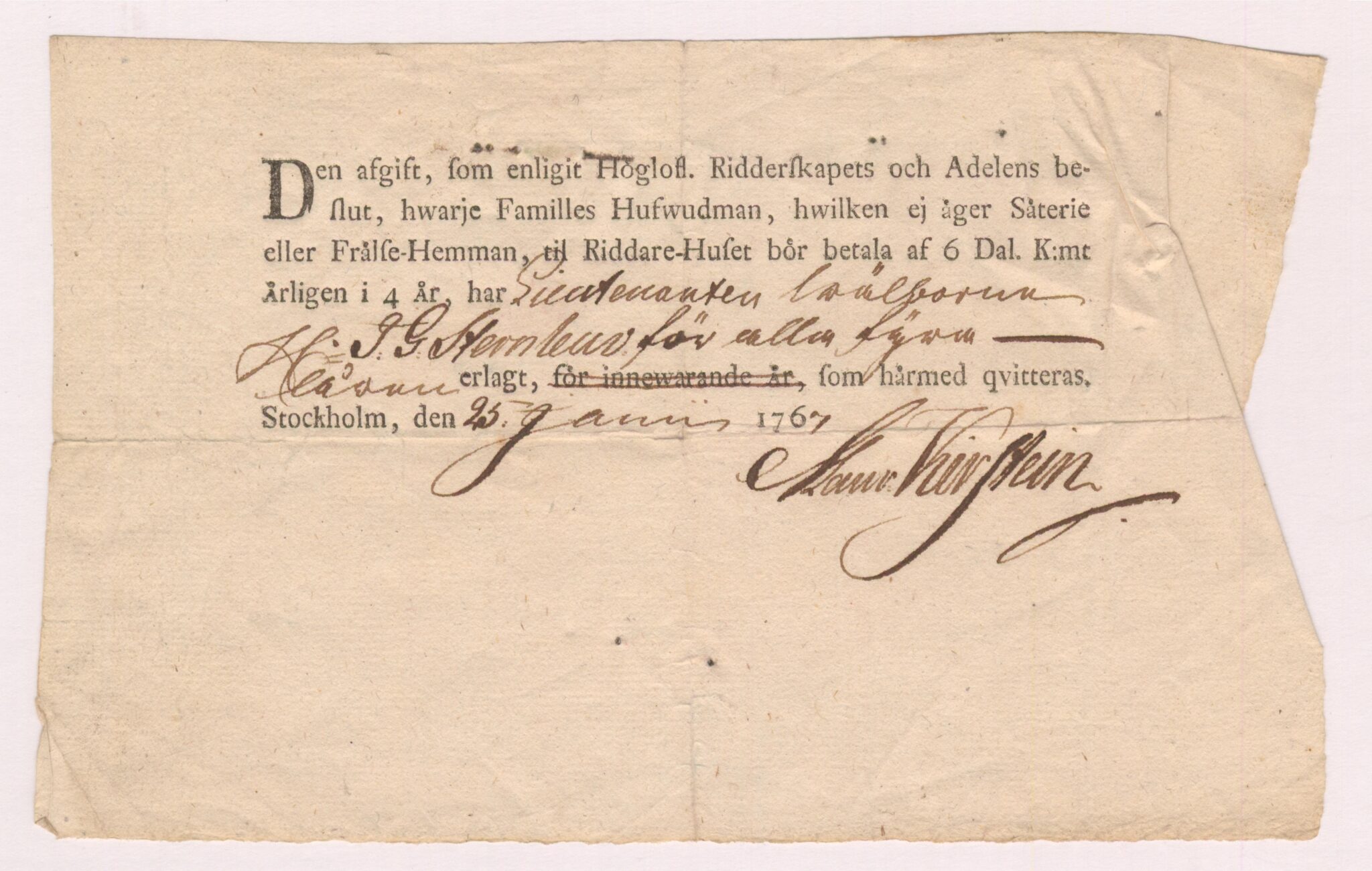 3. Kvittens, avgift huvudman, 1767-01-25.