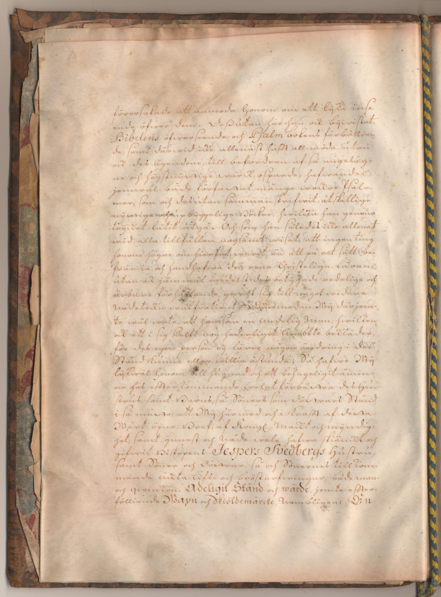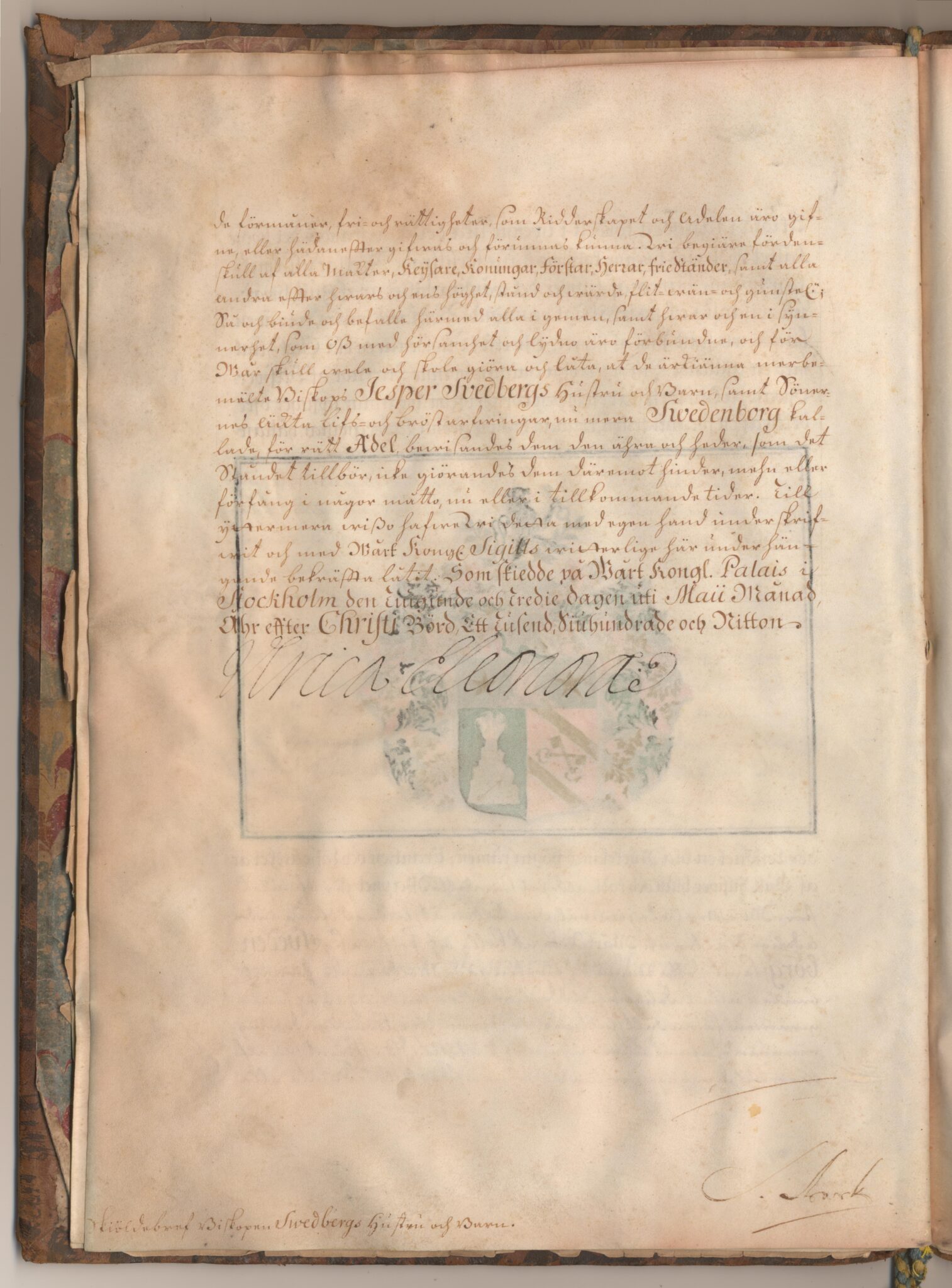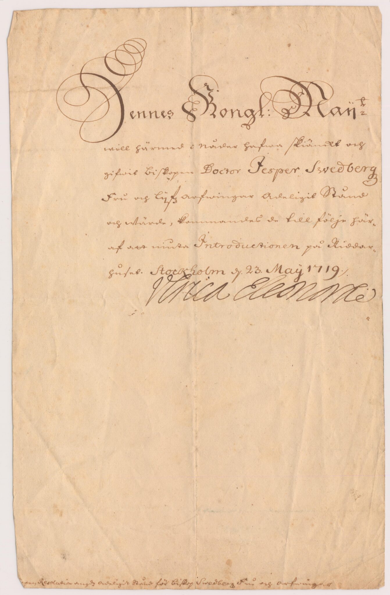 1. Kunglig resolution intygas adeligt stånd för Biskop Swedbergs Fru och arfvingar, signerad Ulrica Eleonora dy 23 maj 1719