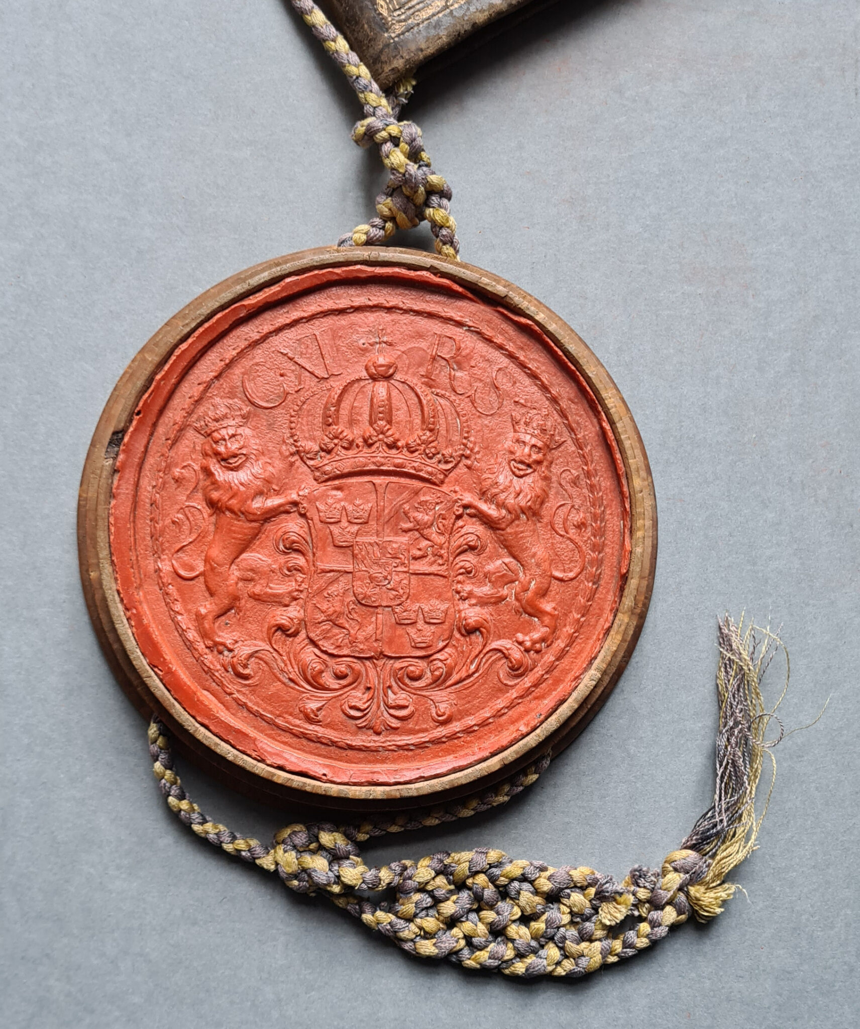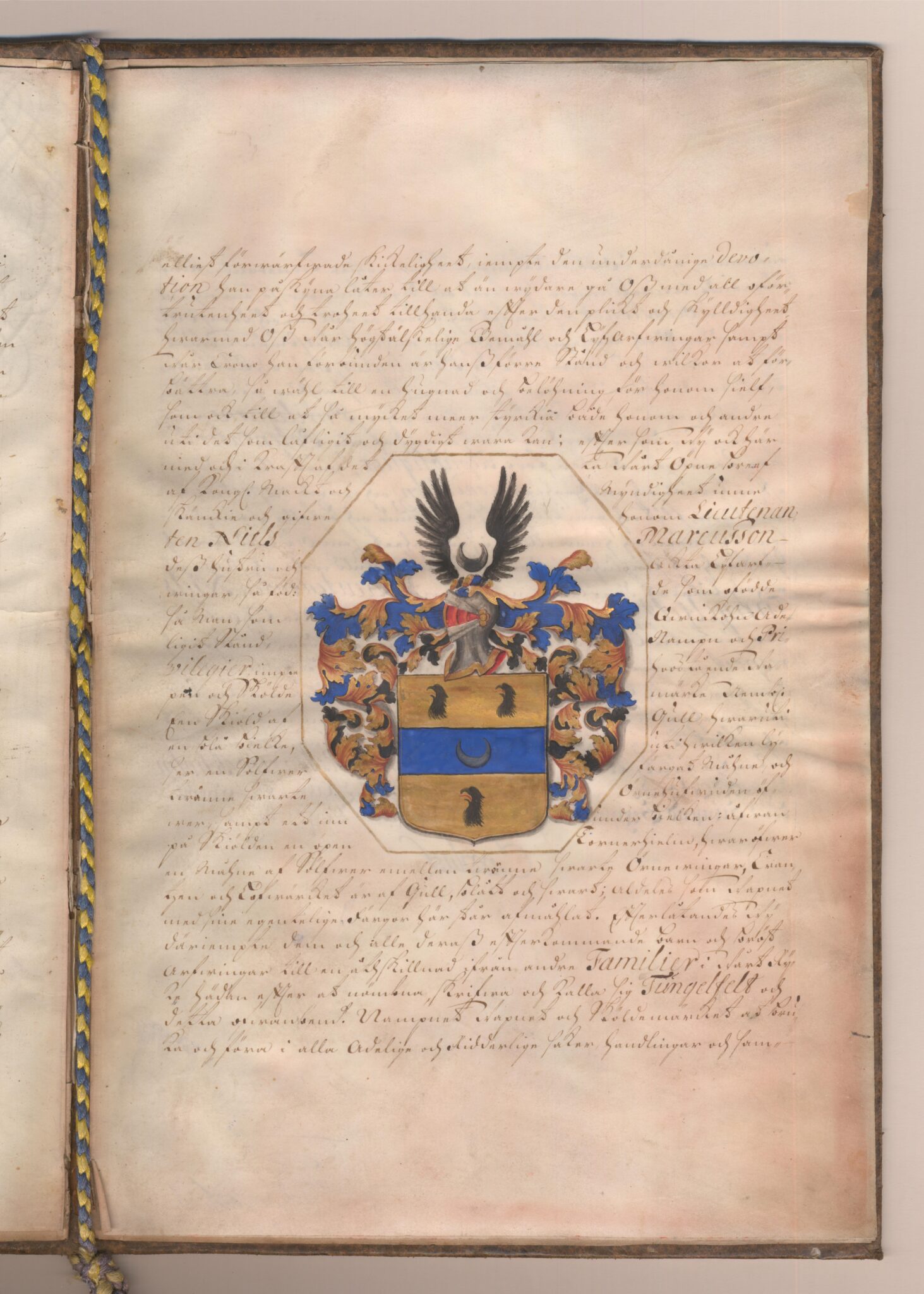 Sköldebrevet i original för utdöda adliga ätten Tungelfelt och Wolberg von Tungelfelt, nr 1155.