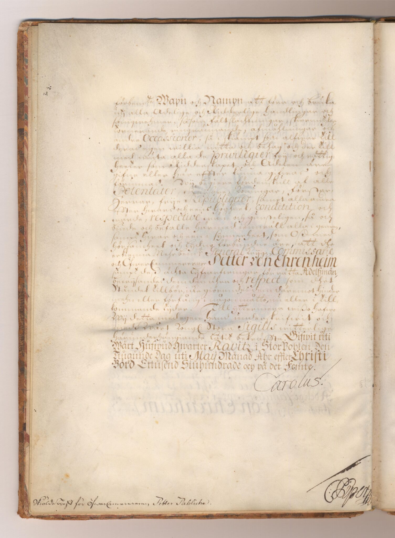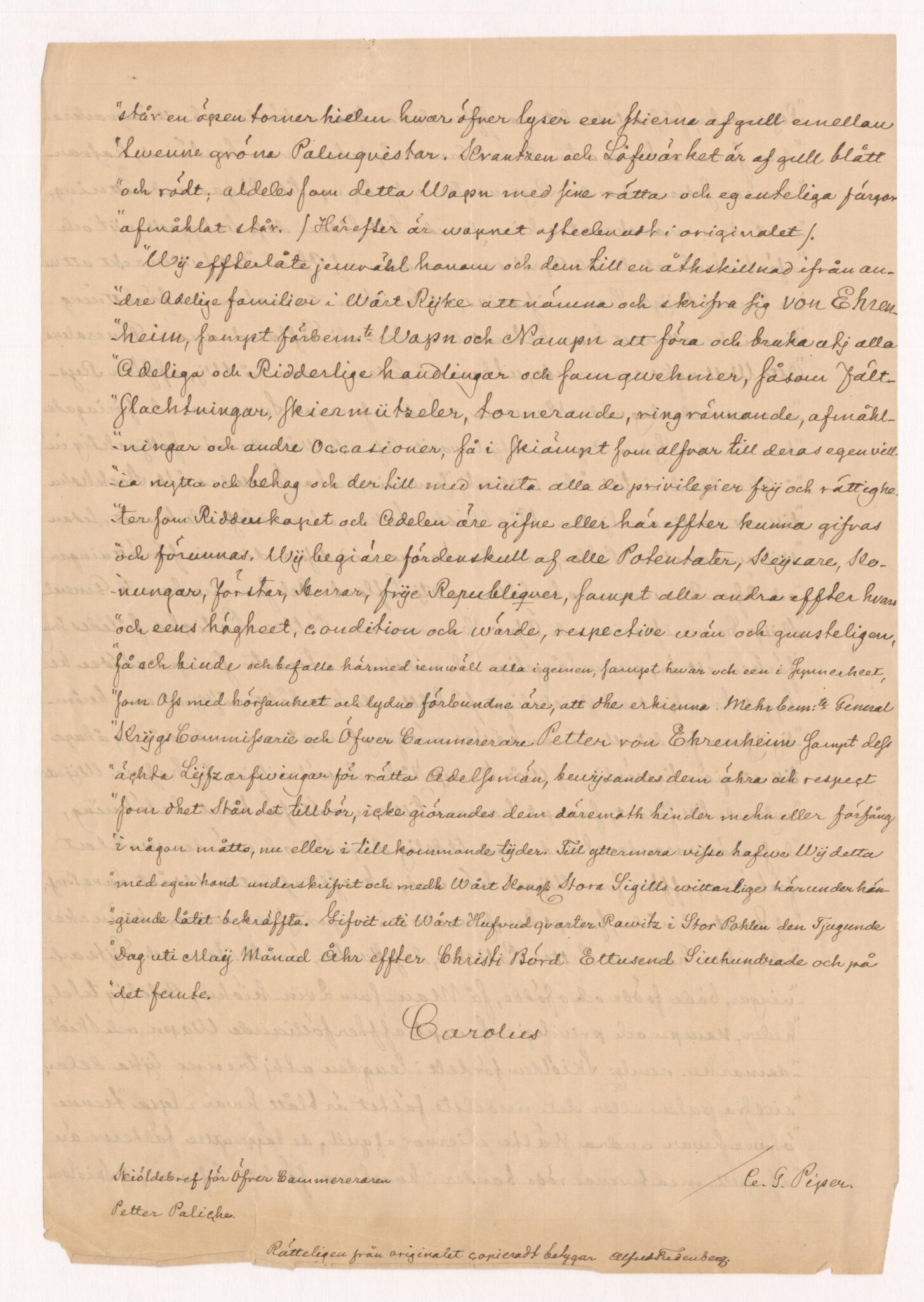 Sköldebrevet i original för adliga ätten von Ehrenheim, nr 1749 B.
