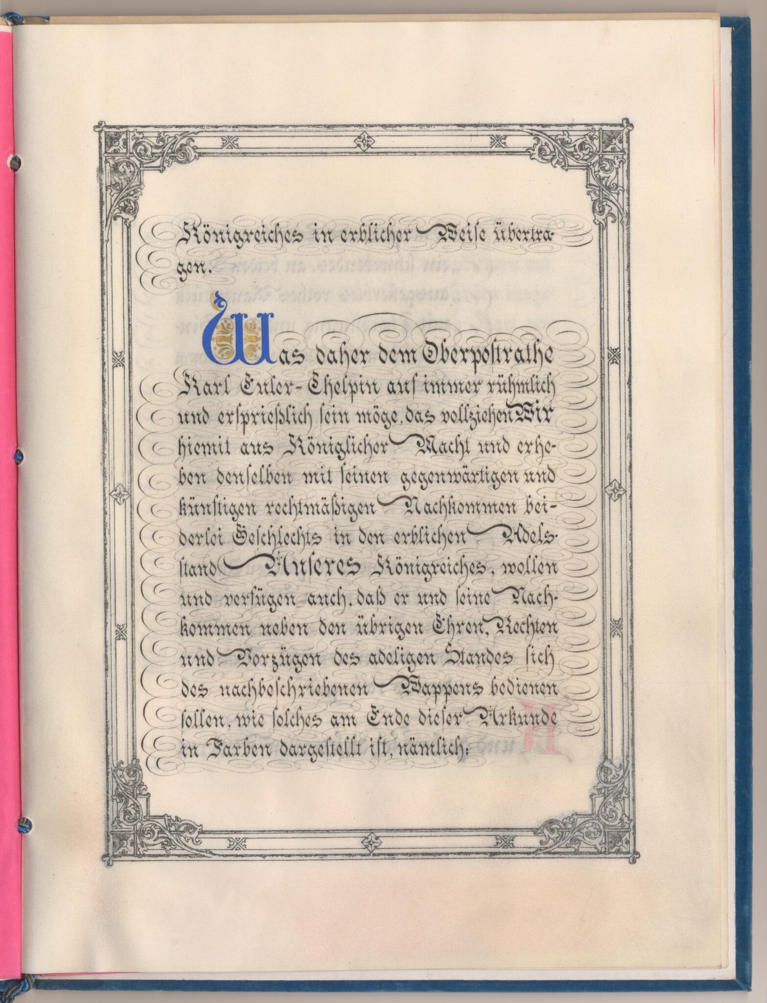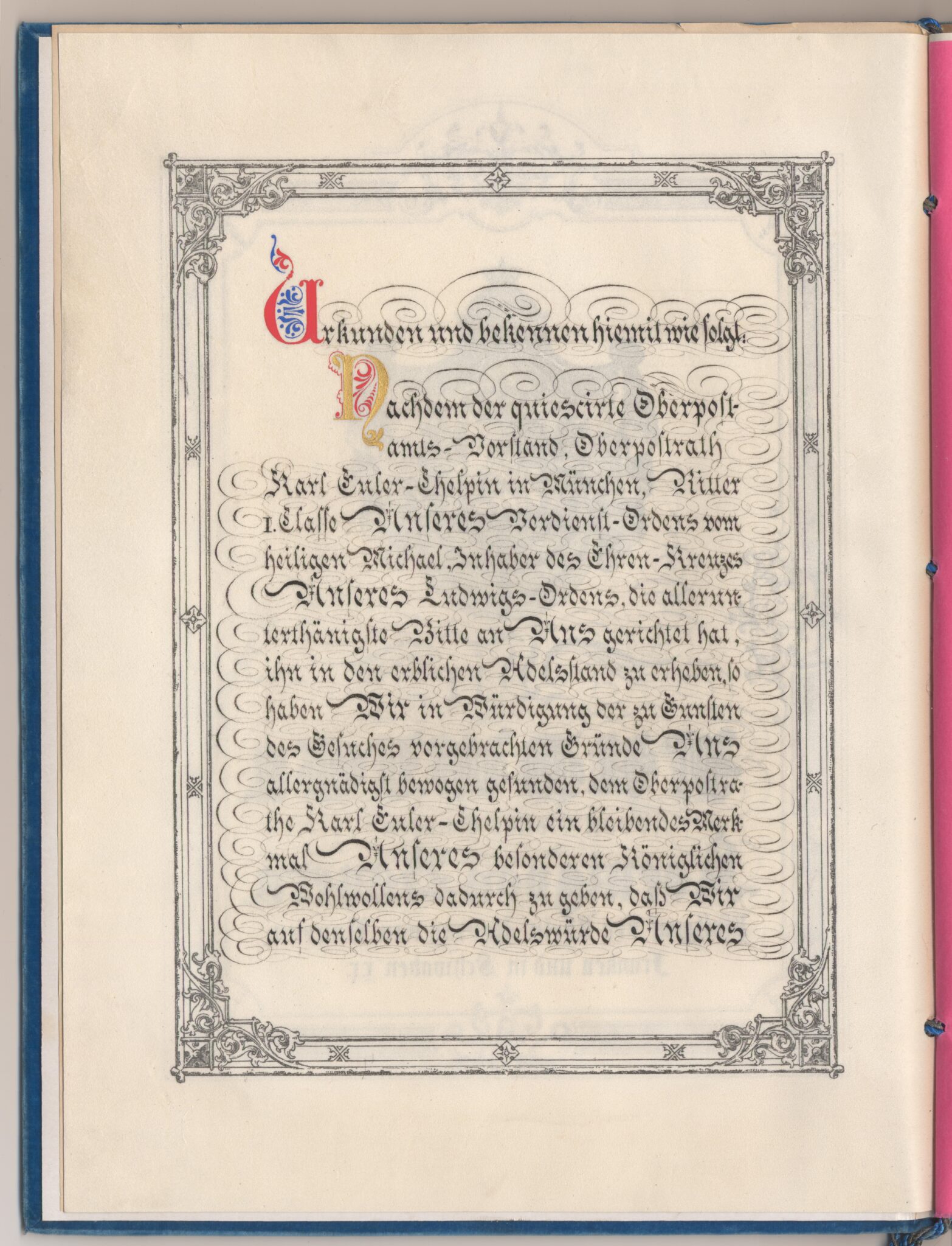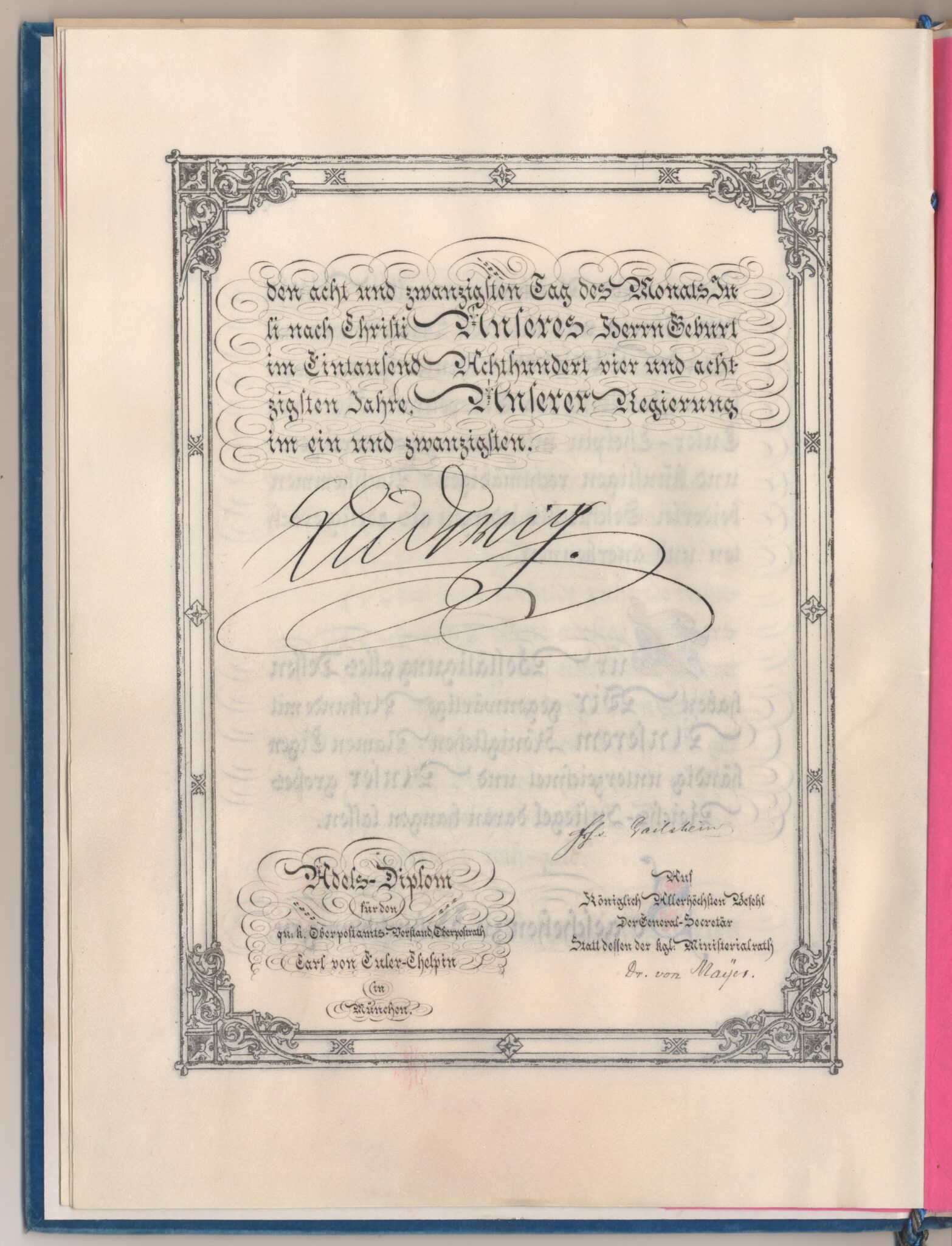 Bayerskt sköldebrev i original för adliga ätten von Euler-Chelpin.