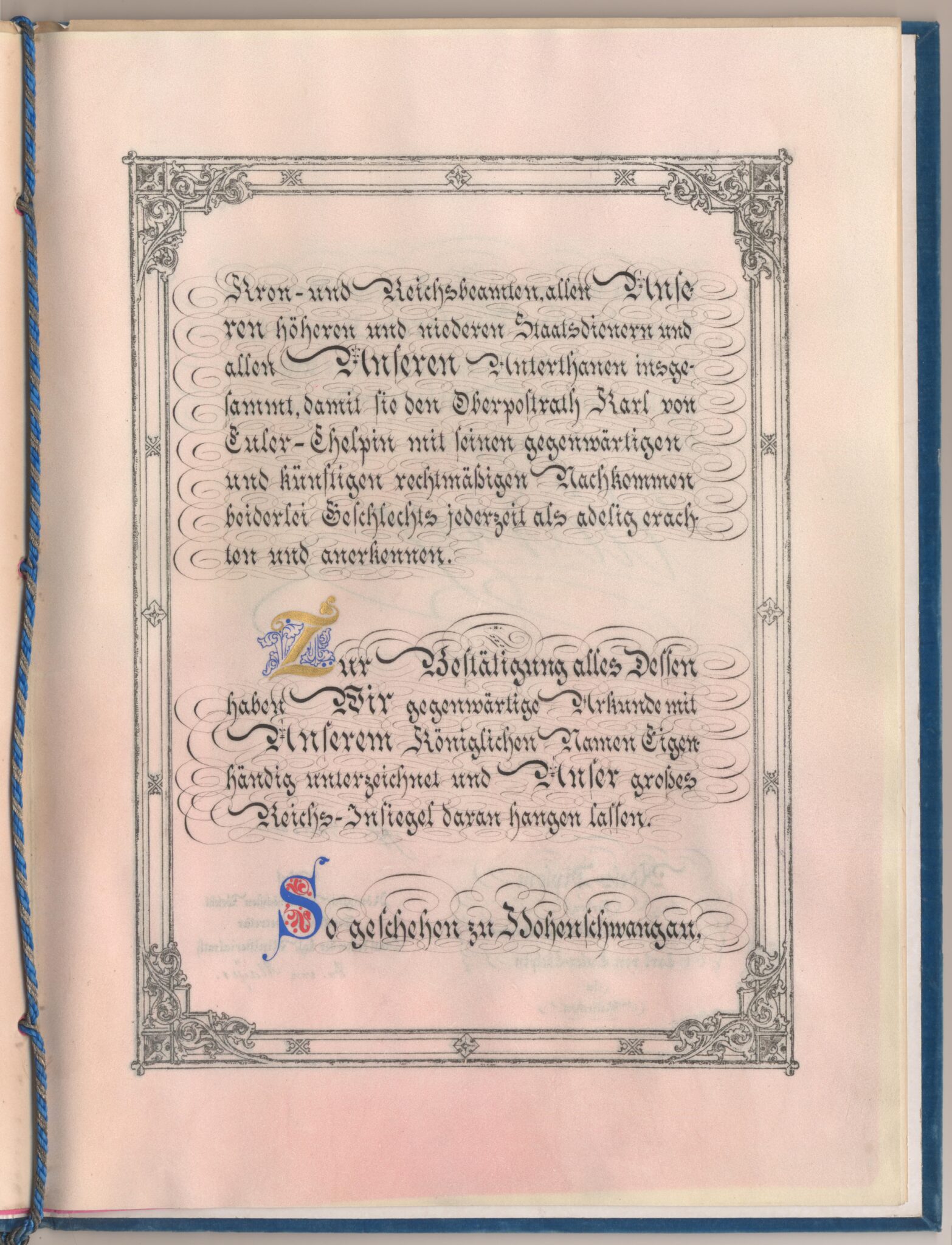 Utfärdat: Ludvig II (kung av Bayern), Hohenscwangau, 1884-07-28.
