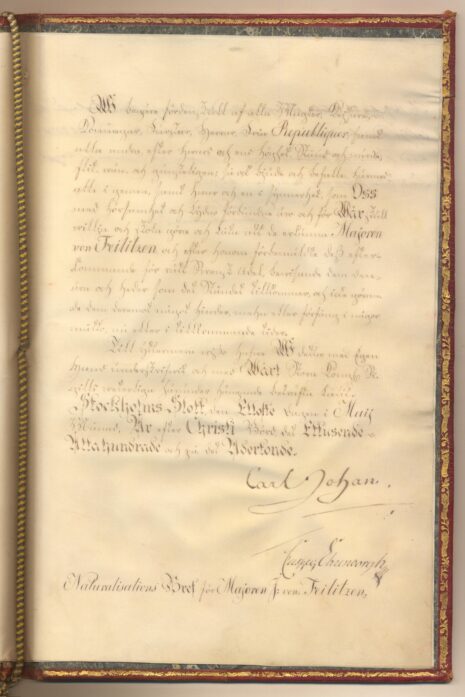 Naturalisationsbrevet i original för utdöda adliga ätten von Feilitzen, nr 2271.