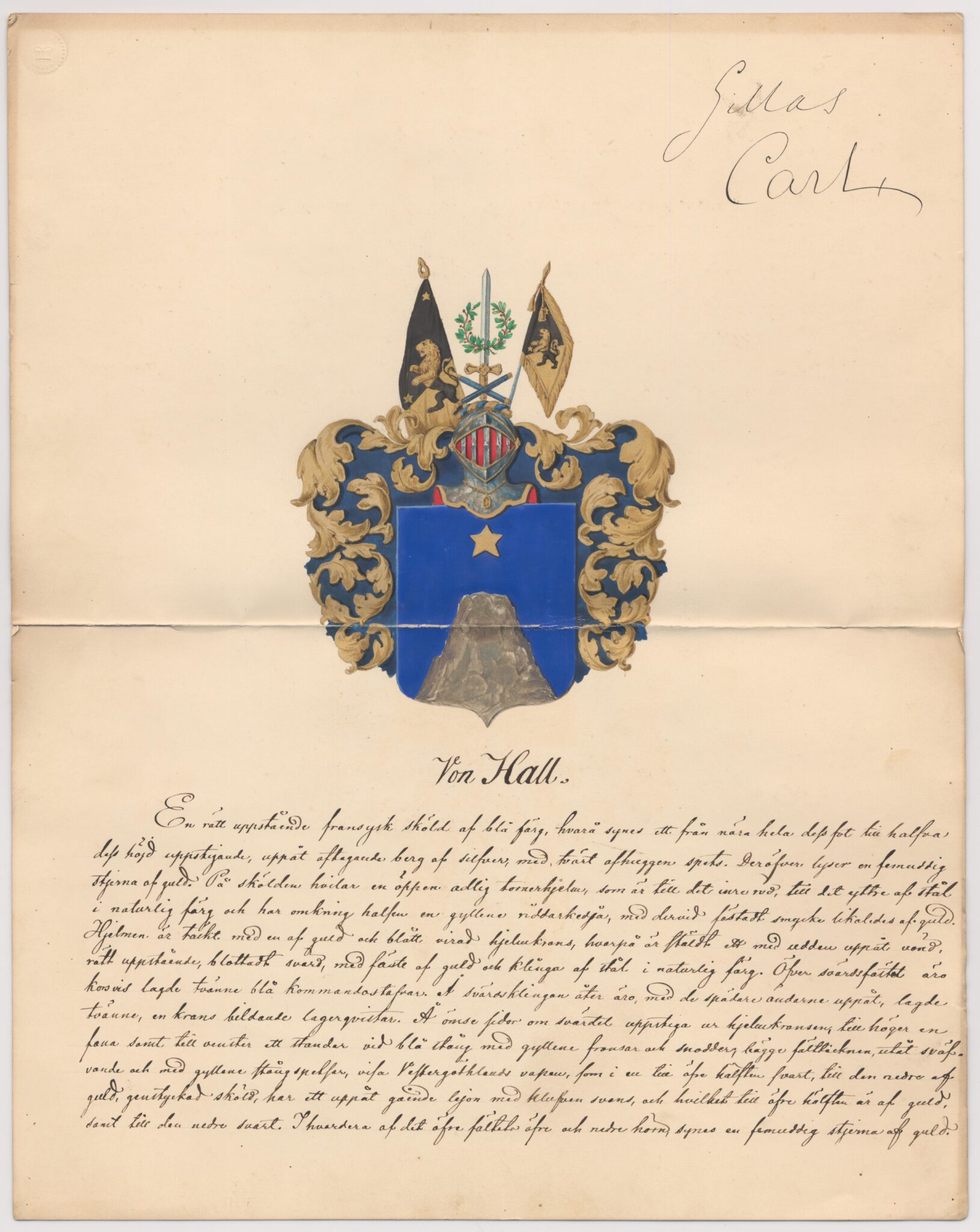 Approberad vapenritning för adliga ätten von Hall, nr 2328.