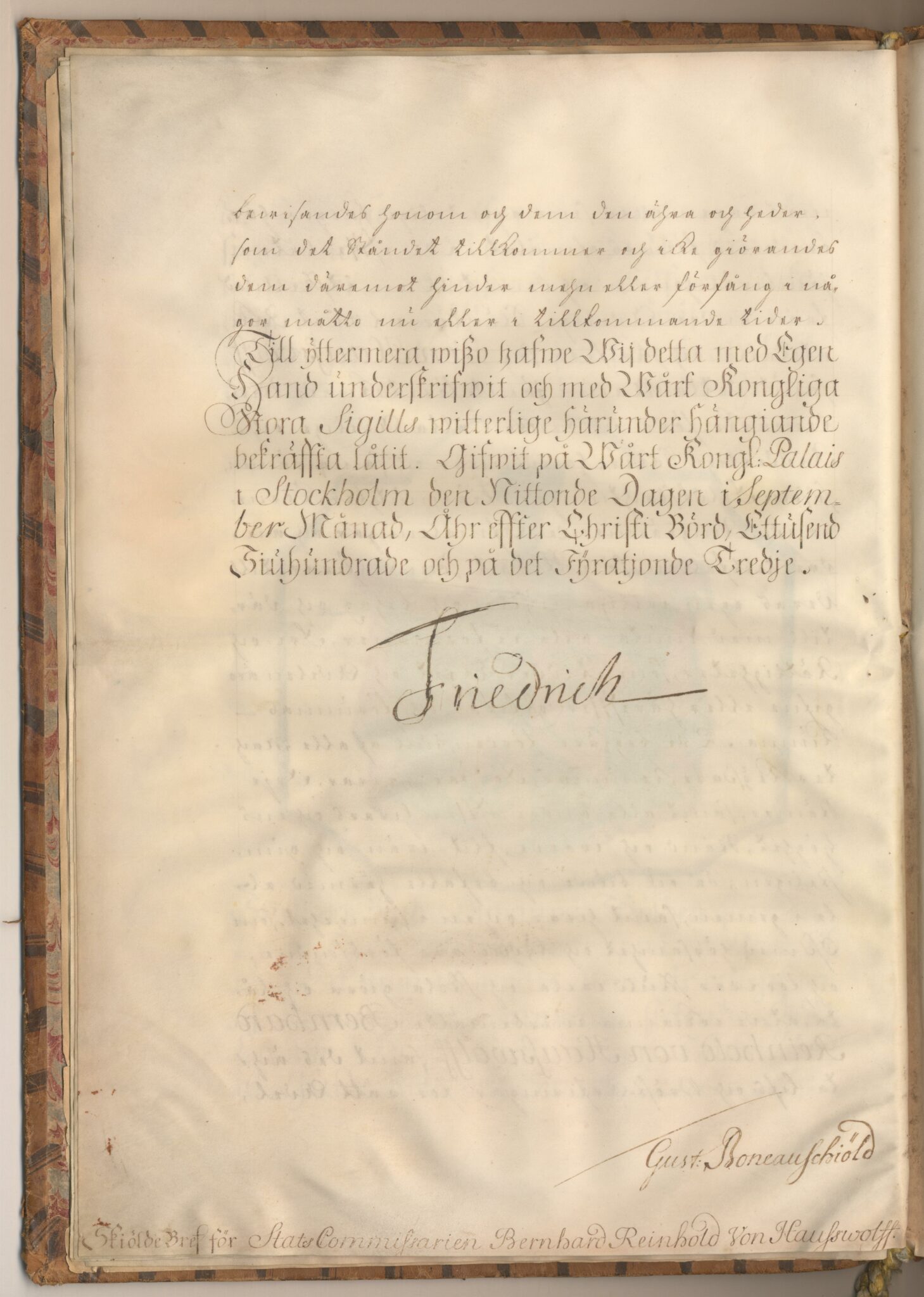 Utnämnd och utfärdat: Fredrik I, Palatset i Stockholm, 1743-09-19.