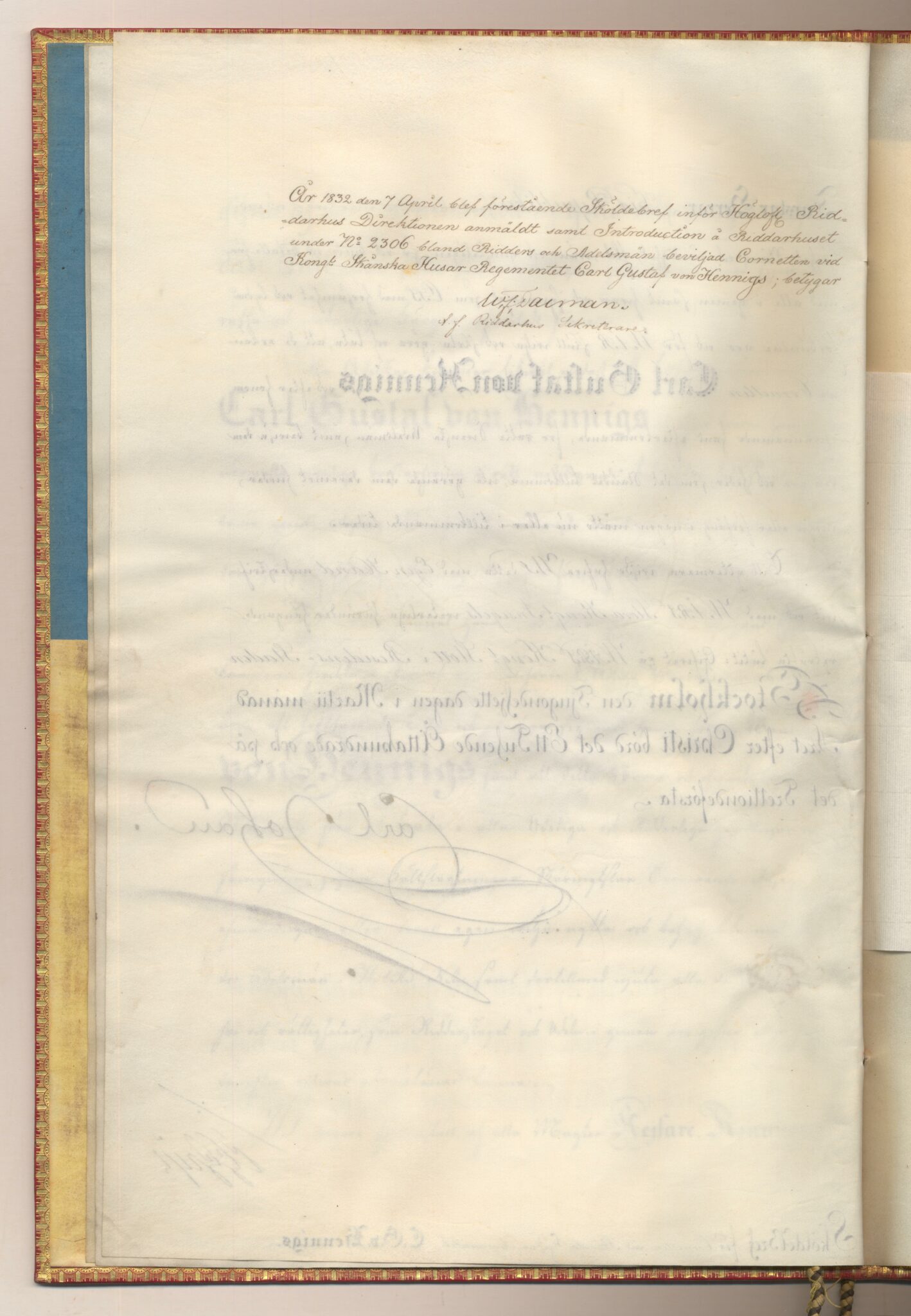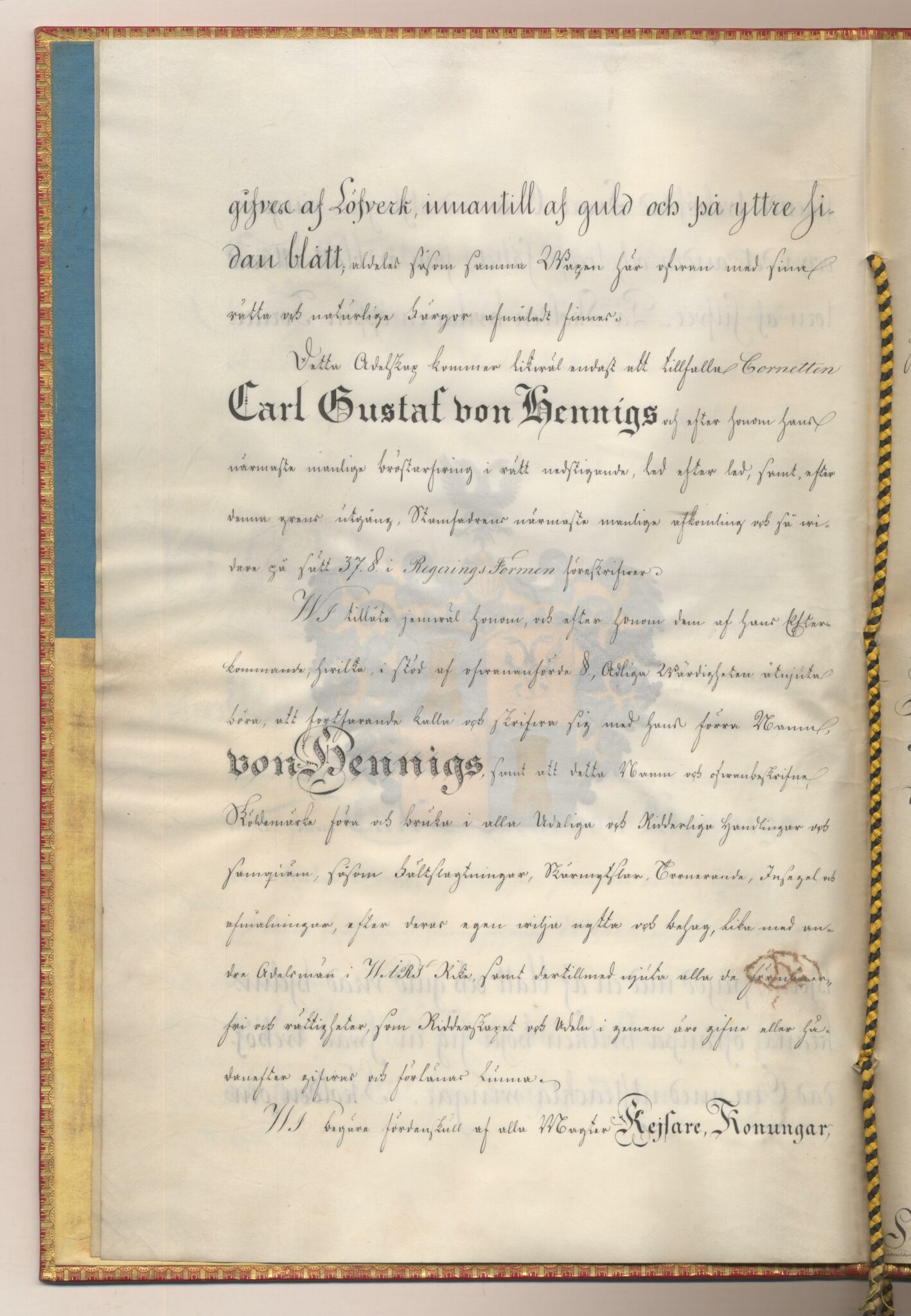 Sköldebrevet i original för utdöda adliga ätten von Hennigs, nr 2306.