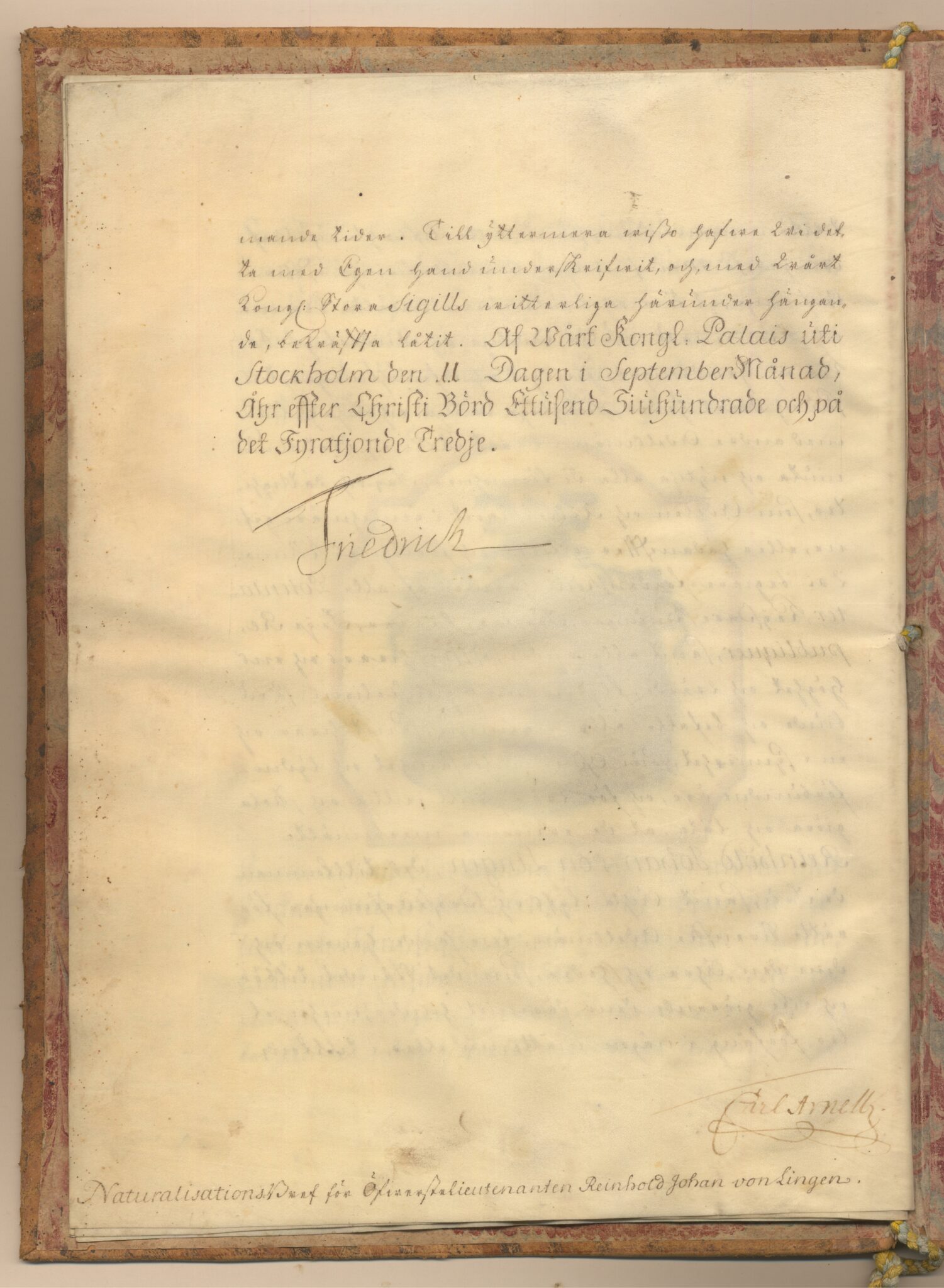 Naturalisationsbrevet i original för utdöda adliga ätten von Lingen, nr 1875 B.