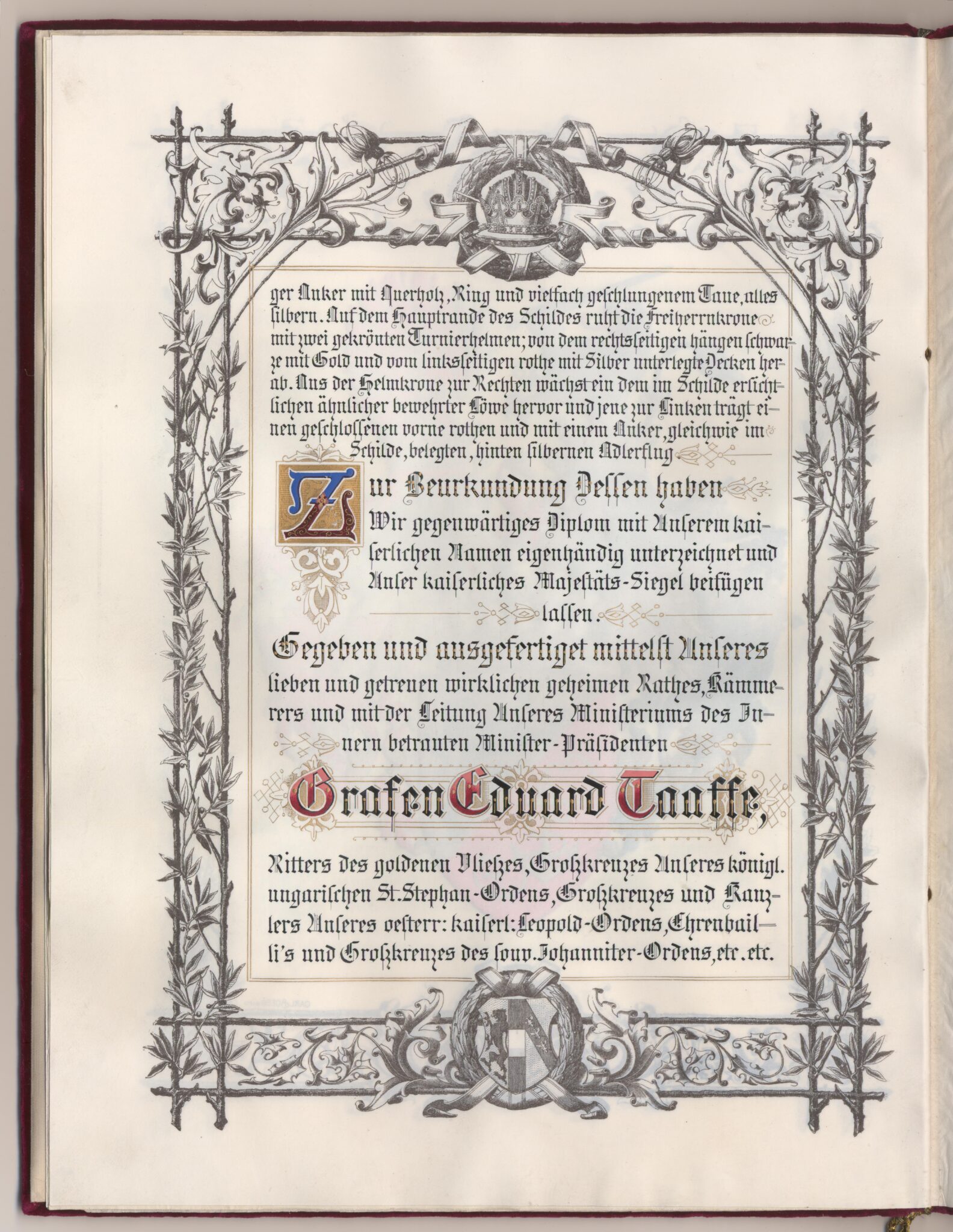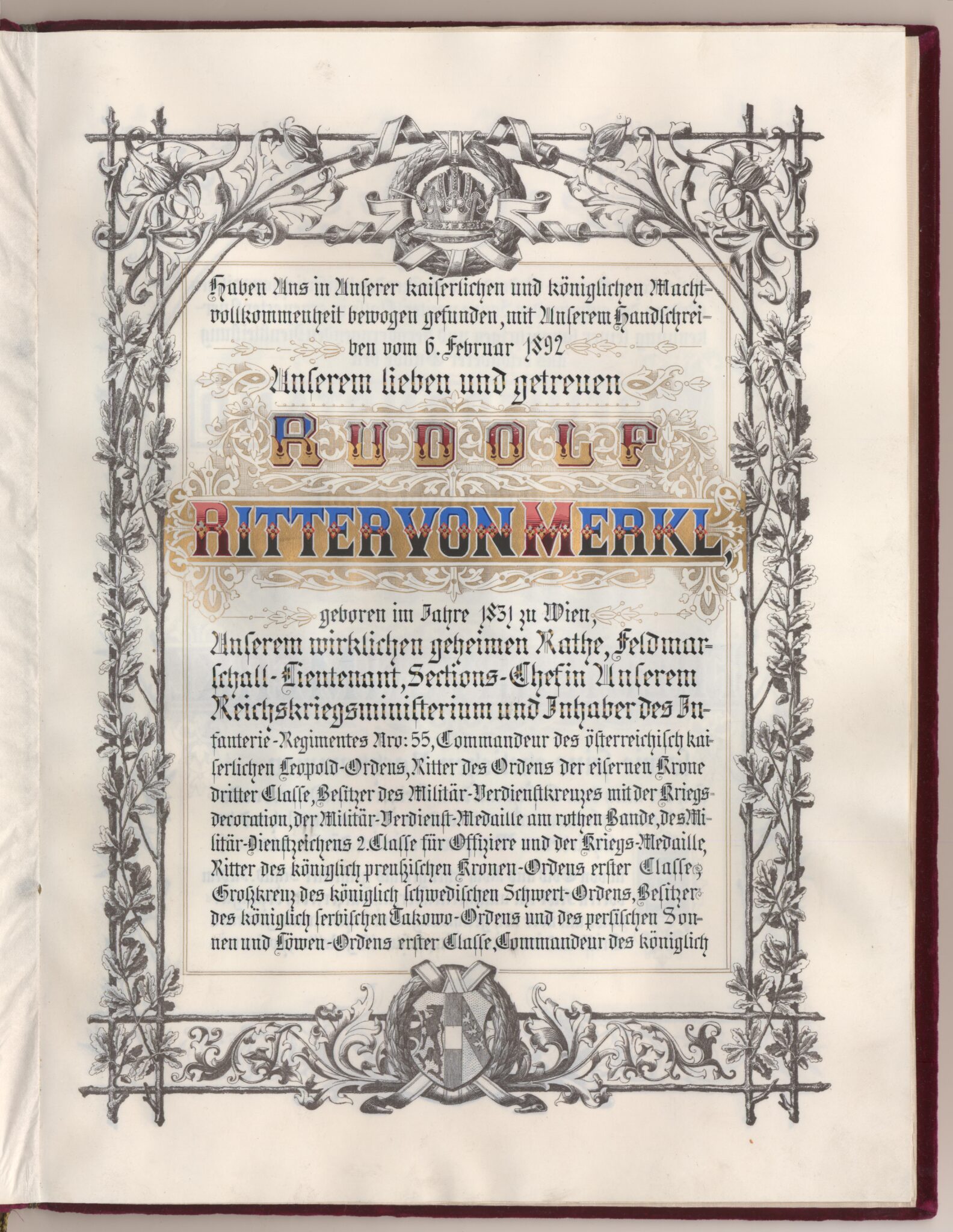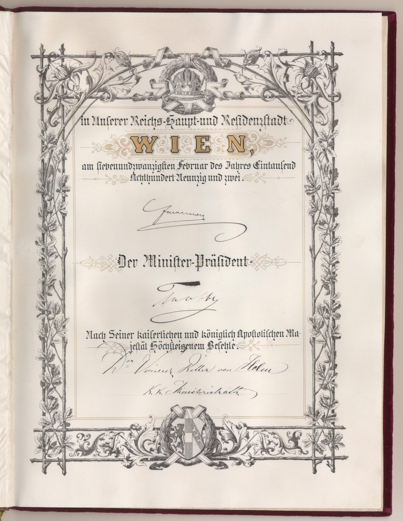 Utnämnd och utfärdat: Frans Josef I (kejsare av Österrike), Wien, 1892-02-27.