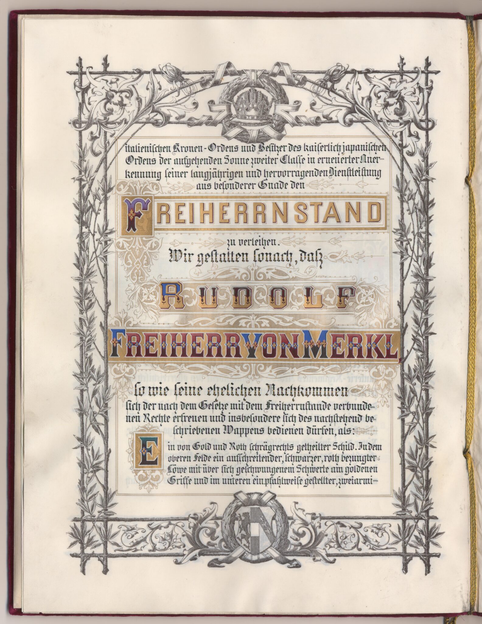 Österrike-Ungerskt friherrebrev i original för friherrliga ätten von Merkl.