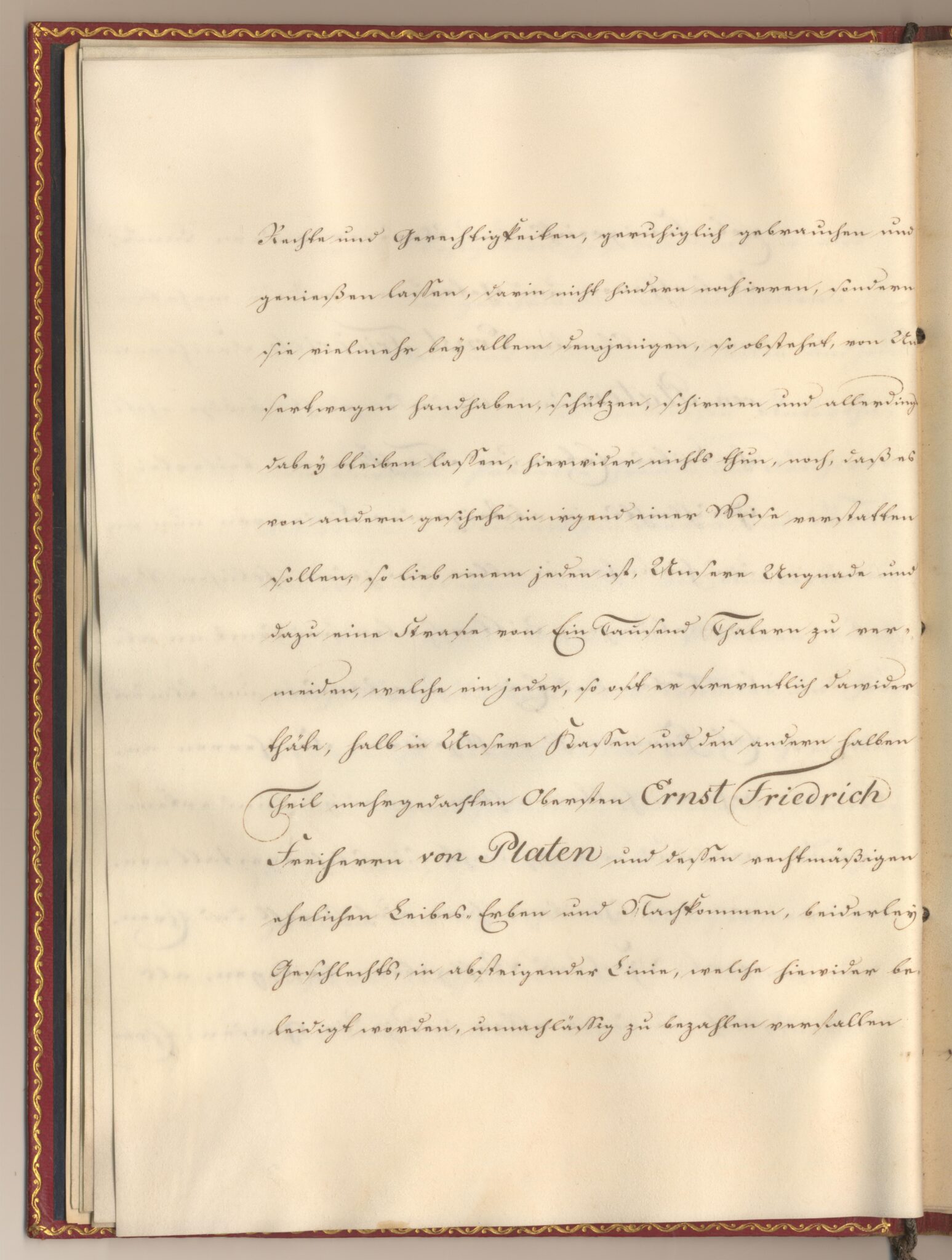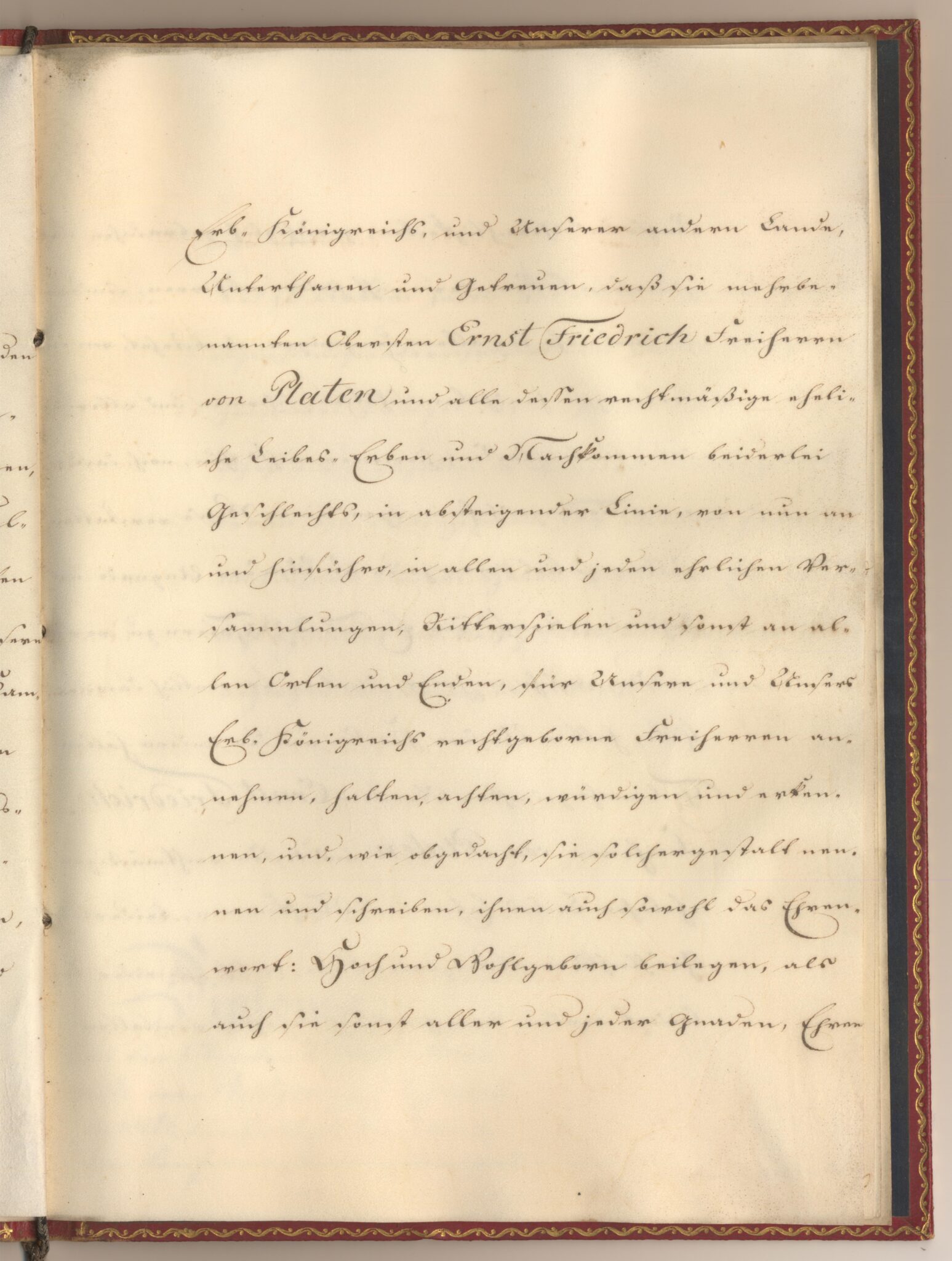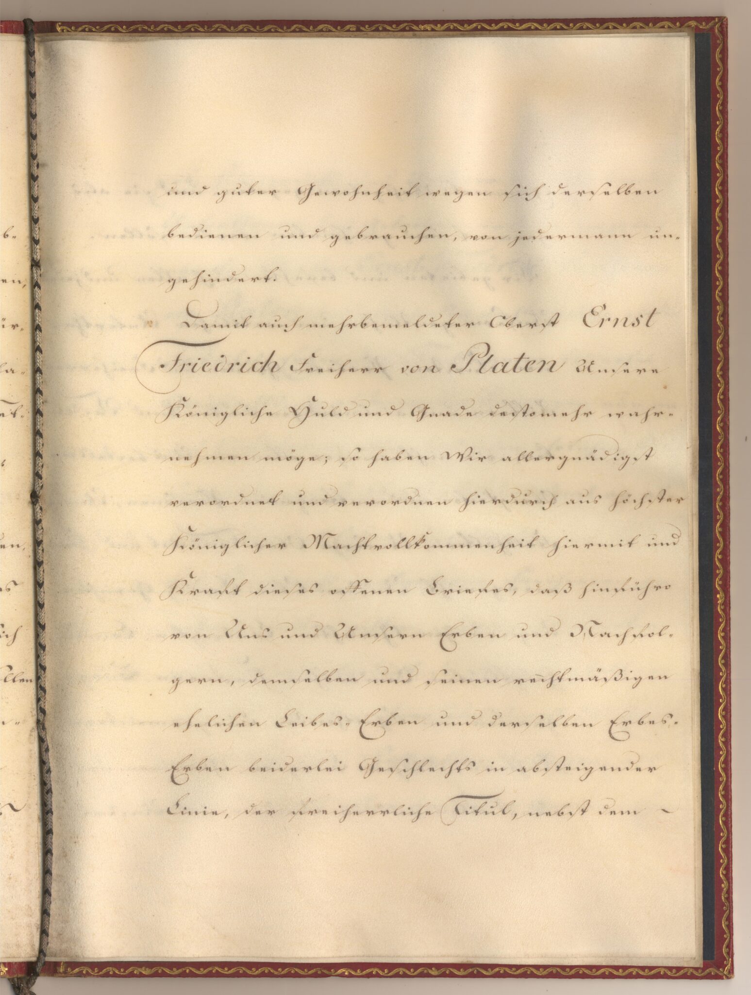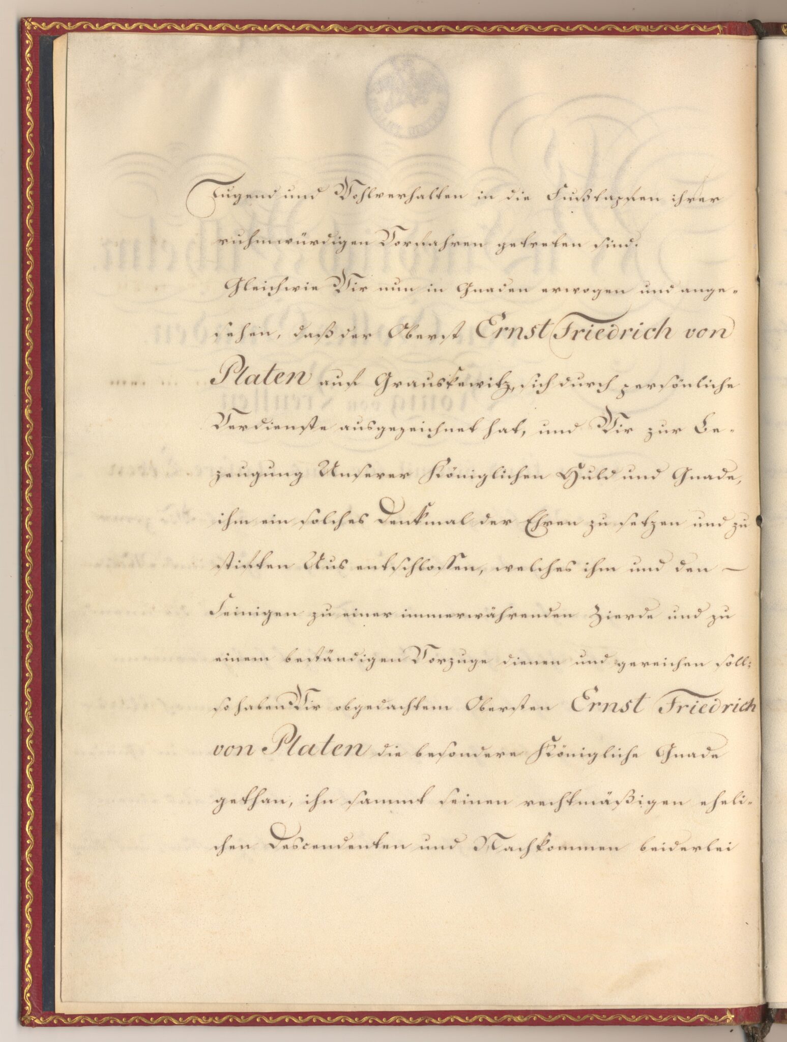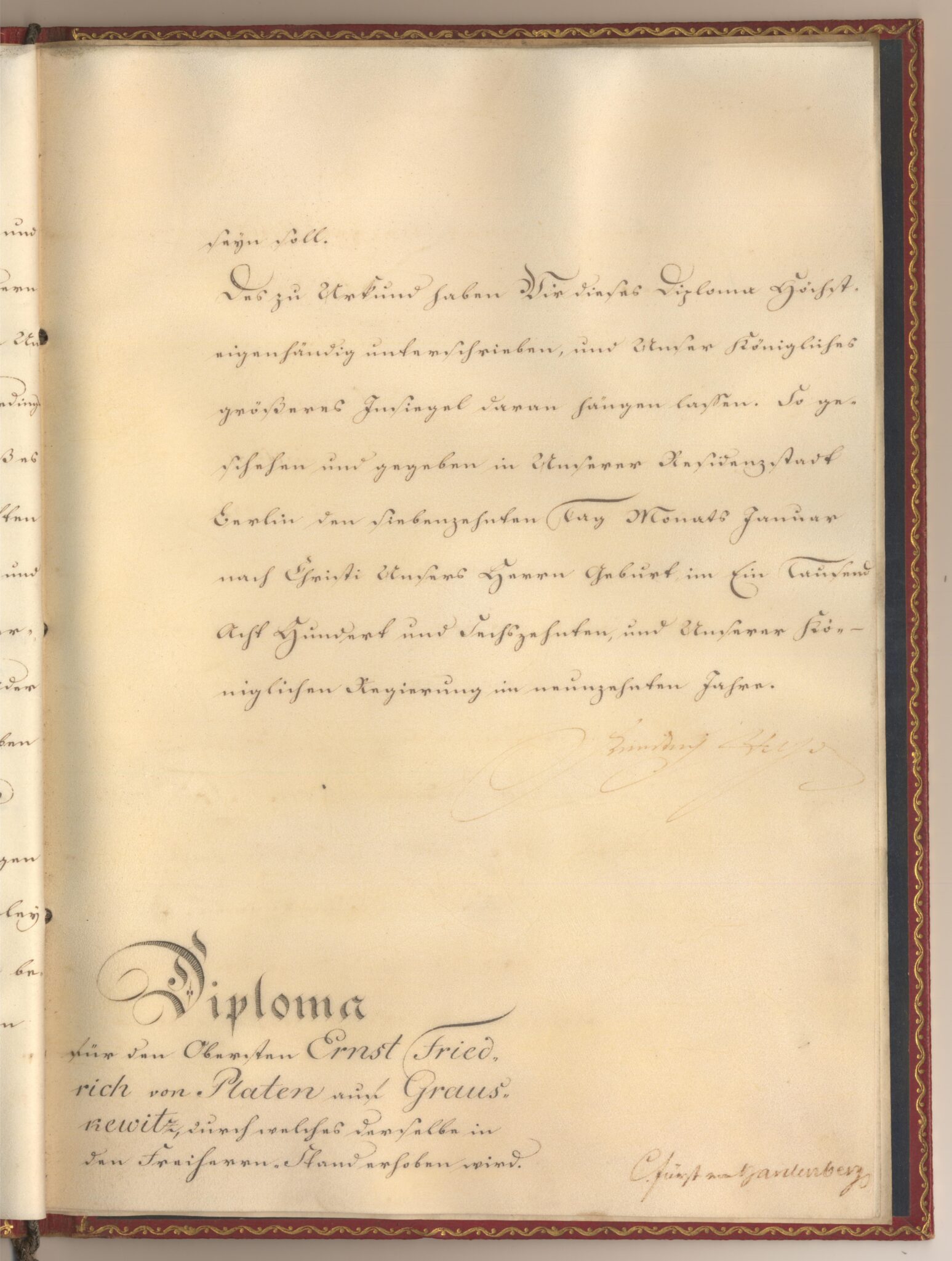Preussiska friherrebrevet i original för friherrliga ätten von Platen (till Granzkewitz).