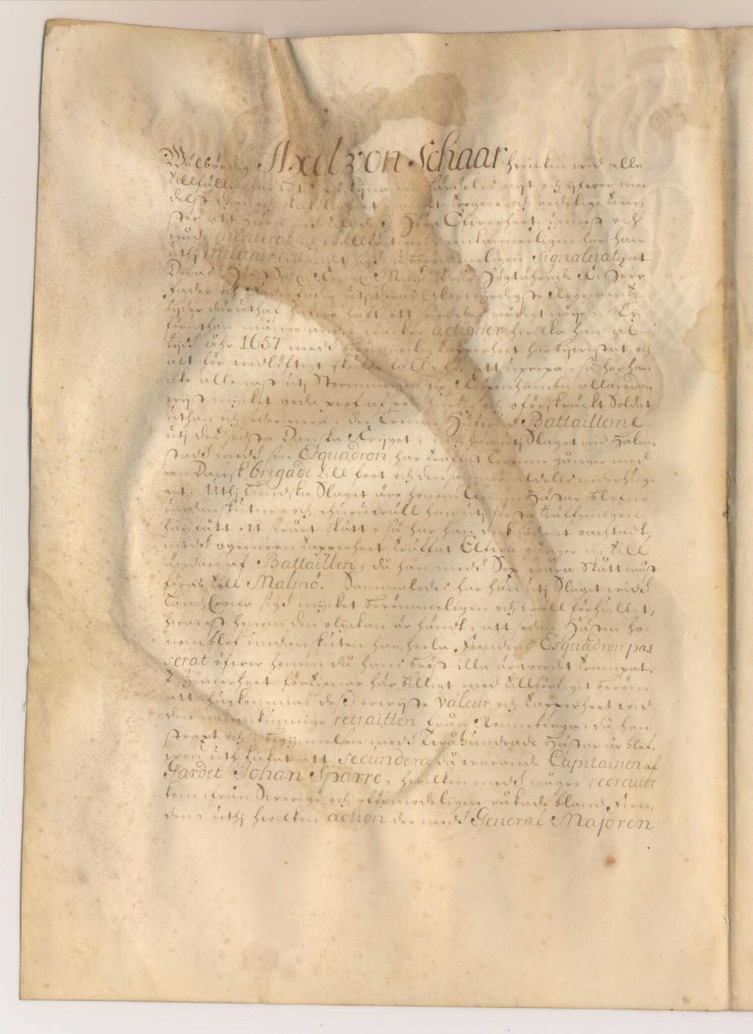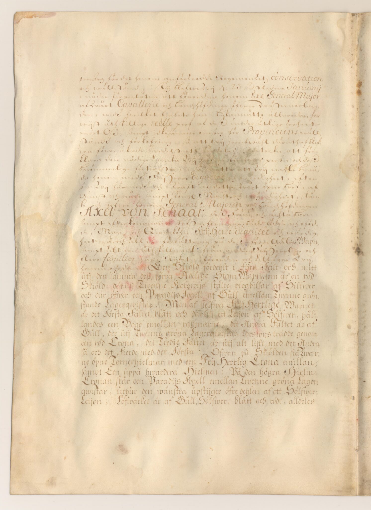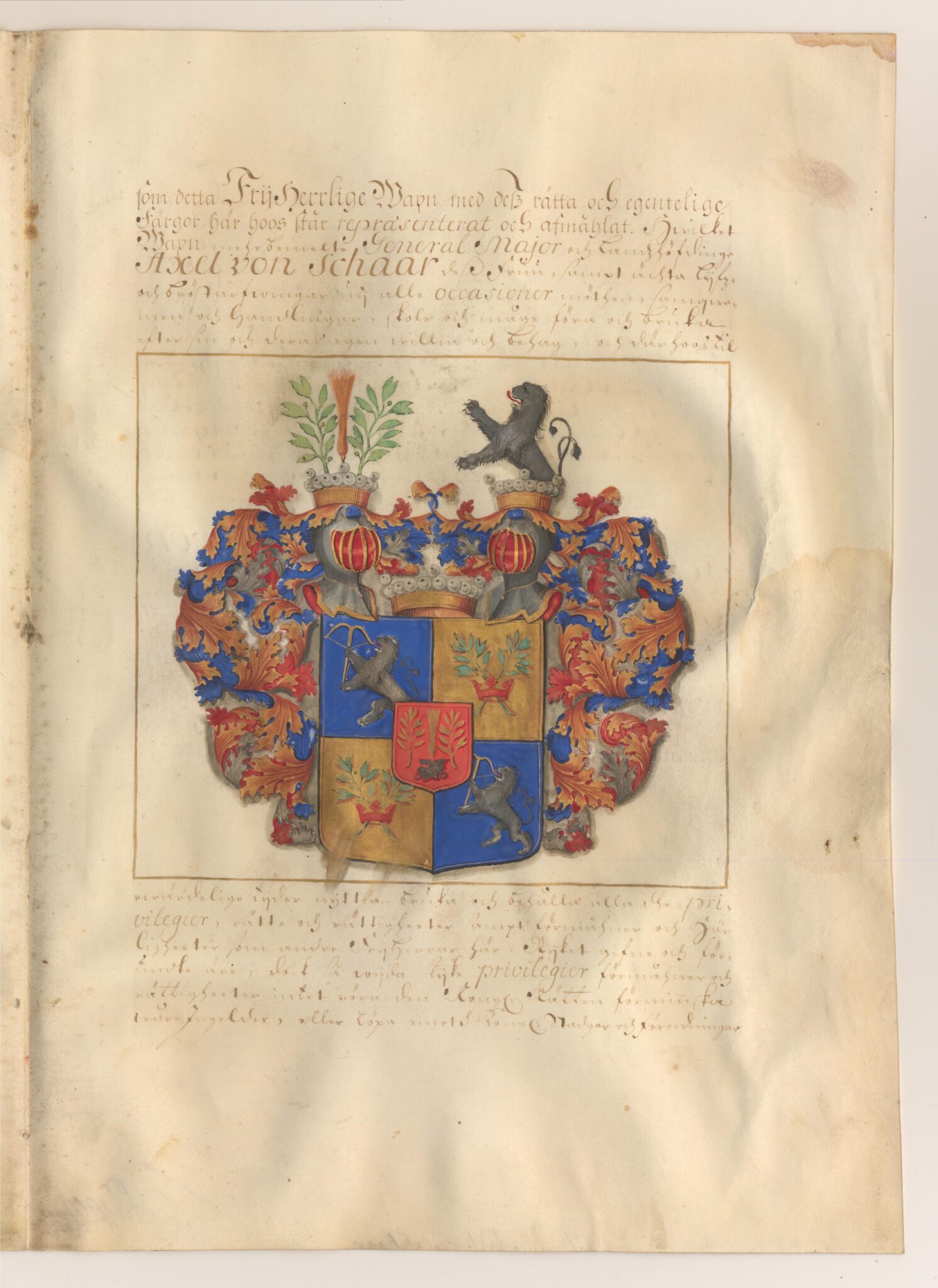 Friherrebrevet i original för utdöda ointroducerade friherrliga ätten von Schaar.