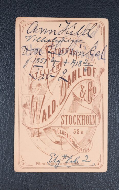 Schinkel, von, Anna Hilda Vilhelmina (ANN-HILD), född Levin. Född 1851-01-02. Död 1918-06-02.